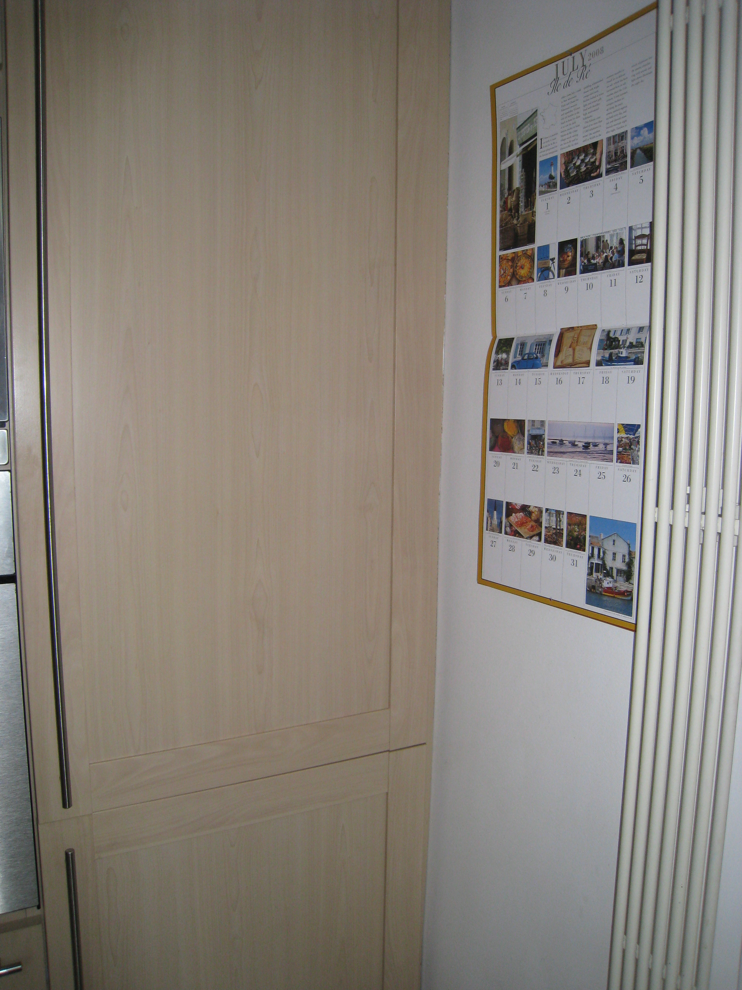 See? There’s nothing ON my fridge. Usually I love weird and whacky magnets, but we currently have wood covering our refrigerator, so nothing sticks to it apart from post-it notes and I’m working hard to stem my addiction to those. What’s NEXT to the fridge is a calendar of beautiful French scenery, including lots of inspiration in the form of market stall pictures. Less interesting is that vertical group of white pipes to the right. It’s some sort of ancient radiator which we leave turned off because, when it’s on, it has a habit of making sounds like a UFO landing on the roof, which can be somewhat disconcerting when it happens at 3 in the morning.