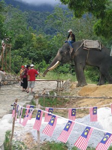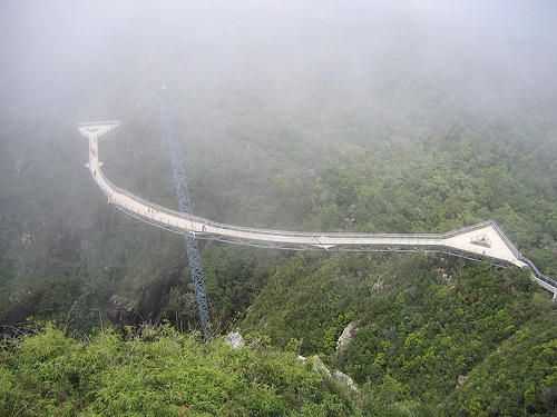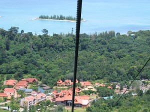 We pulled into the car park at Oriental Village, a purpose-built visitor complex at the base of the Mount of Mat Chinchang. As always, the hot, humid air hit us like a wall as we got out of the air-conditioned jeep. (Come to think of it, air conditioning and jeeps sound wrong together.) We were soon jetting up the mountain in a modern cable car to view Langkawi from high. At the top of the Mount there are viewing platforms from which you can take fantastic photos. There’s also a pedestrian suspension bridge like a snake of steel cables between peaks. I didn’t make it very far along the bridge because it trembled (as suspension bridges are liable to do) and seemed to hang in thin air. It was also a long, rocky, bushy way down to the ground below. Chicken-licken here walked back to the non-shaky platform and stayed there, feet firmly planted on a surface that did not shake.