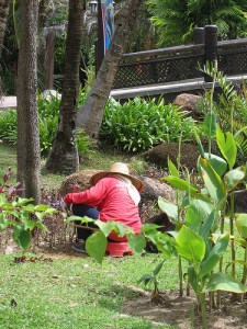 Walking through the village, we saw an elephant taking people for rides. I’ve never ridden an elephant and I’d love to, but we didn’t have enough time so I’ve put this on the future adventure wish list along with swimming with dolphins. It was pretty quiet at the Village, considering. As we sat with a bite of lunch (fish ‘n’ chips for me, something resembling food called a chicken chop for Monsieur – everything else was closed), I noticed women in broad-brimmed straw hats quietly tending the gardens around the Village. There was something so humble about them but the plants all looked luscious so they must have been doing something right with the elephant dung.