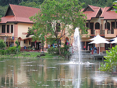 The rest and quiet did the world of good so I no longer felt like an axe was breaking through my skull by the time we jumped in the jeep. Off we went with a vague sort of tourist map of Langkawi, heading for Oriental Village. We drove past some sights which were now familiar following our chauffeur-driven tour – the falling-down resort, the airport, the marina and the three man-made islands. As we drove up into the jungle, leaving the coast behind, we hit a Langkawi traffic jam, holding us up all of about ten minutes (this is nothing if you live in London, so as we sat at a standstill, Monsieur and I sang along happily to Brady Bunch songs on the radio. Okay, well perhaps it wasn’t the Brady Bunch, per se, but happy songs all the same).