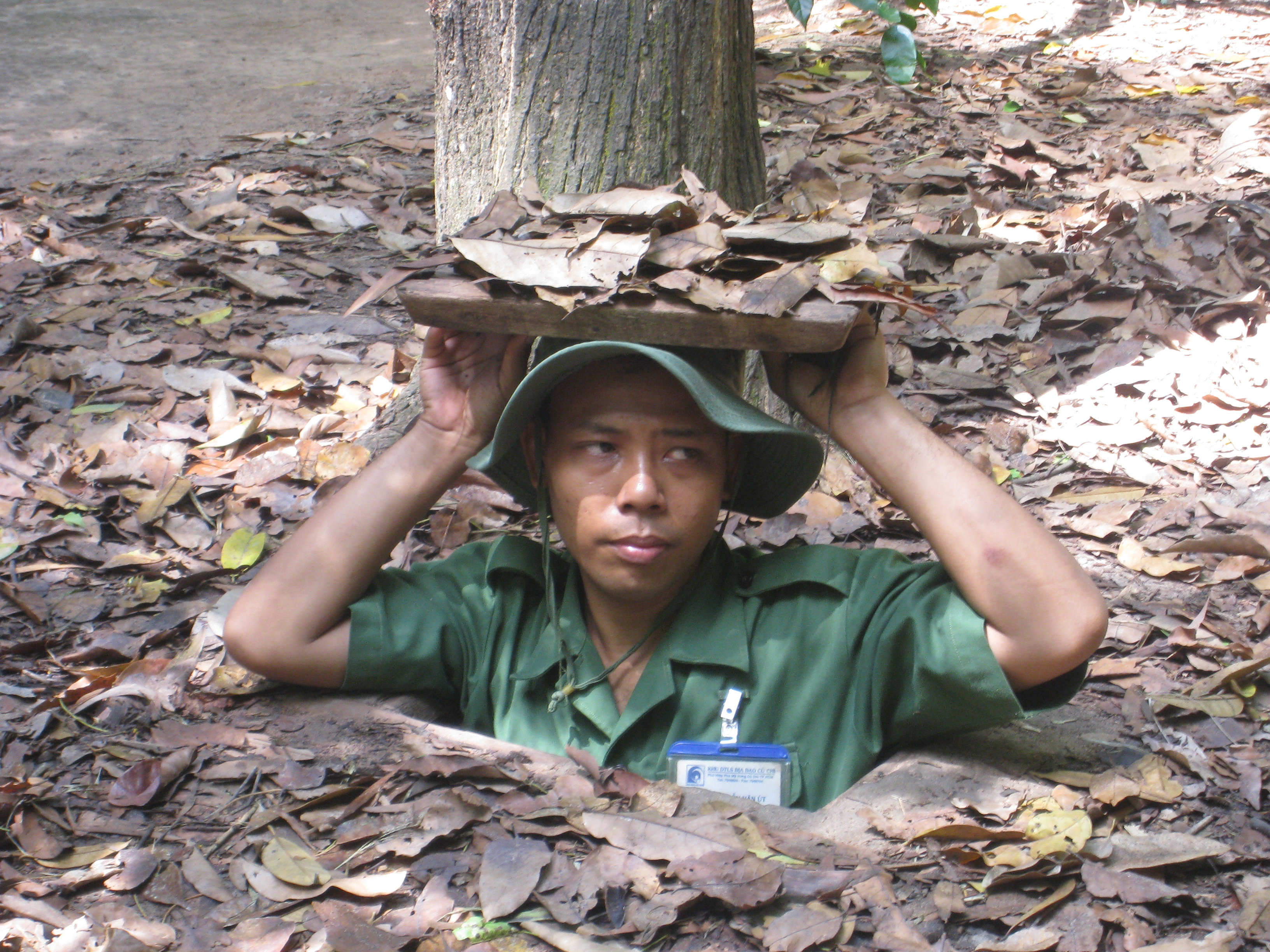 The following day, I photographed a different sort of manhole, this time with a man IN it! That’s right, people, this manhole was so well disguised by dead leaves and undergrowth that I had to find a local model to demonstrate it. Unfortunately, Monsieur and I simply would not fit down the teeny weeny manhole made for teeny weeny Viet Cong, so this chap, with the hips of a Barbie doll, obliged instead. This shot was taken at the Cu Chi Tunnels, just outside of HCMC. The Cu Chi Tunnels were a sophisticated network of underground tunnels and chambers created by the Viet Cong in the late 1940s and of particular strategic influence during the American War.