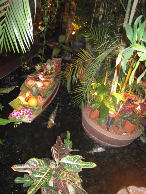 Our waitress led us along a pathway which weaved in and out of tables and separated seating areas. Was that a boat floating on the bubbling stream filled with carp? Yes, it was. In one corner a smiling gold Buddha sat in prayer. In a word: WOW. I started planning when to bring Monsieur for a visit and I hadn’t eaten a single bite of anything yet.