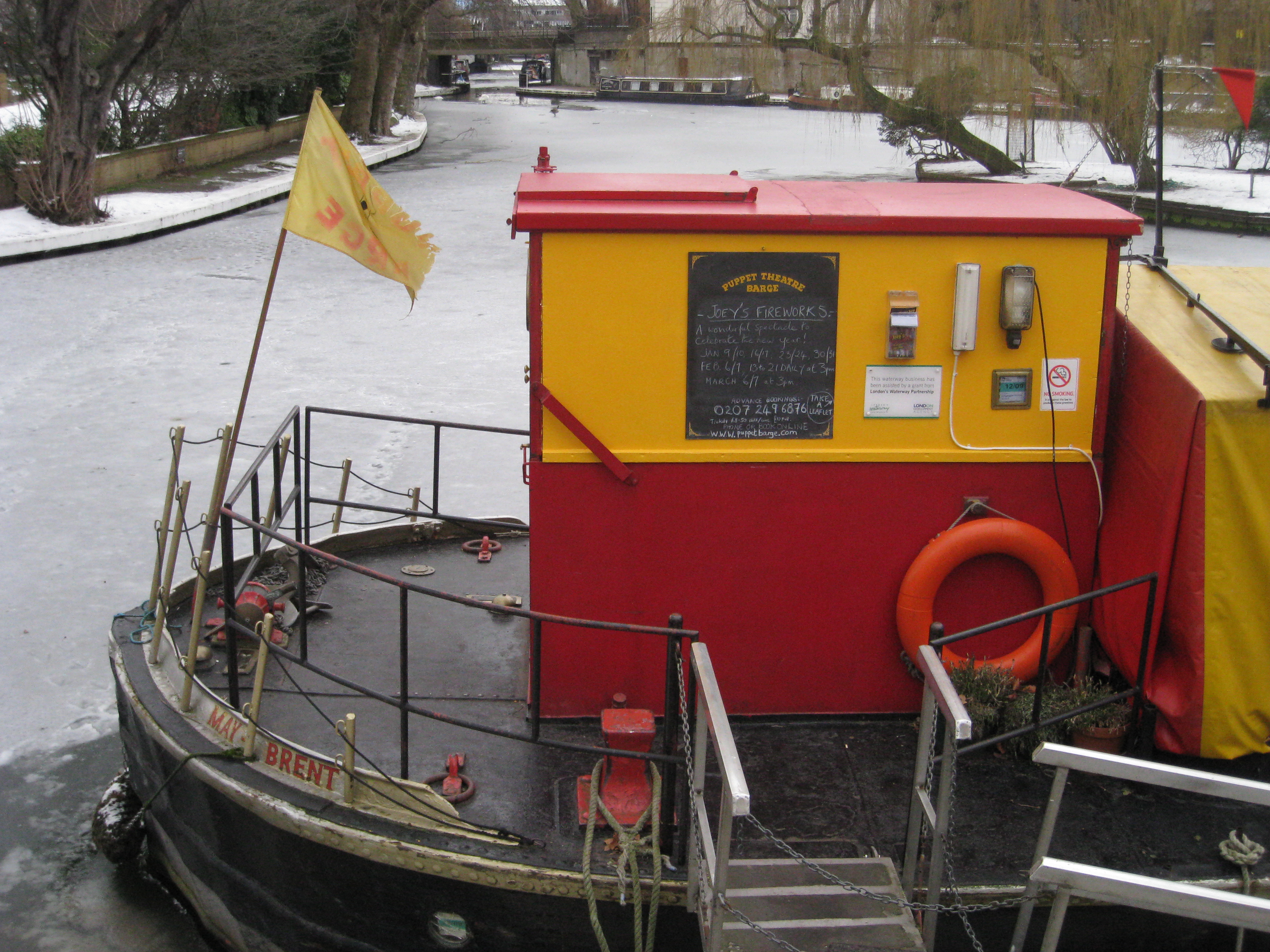 A rare patch of water was visible under the other side of the blue bridge. Further along I found the beautiful red puppet theatre barge, which brought its optimism to the otherwise grey-and-white day.