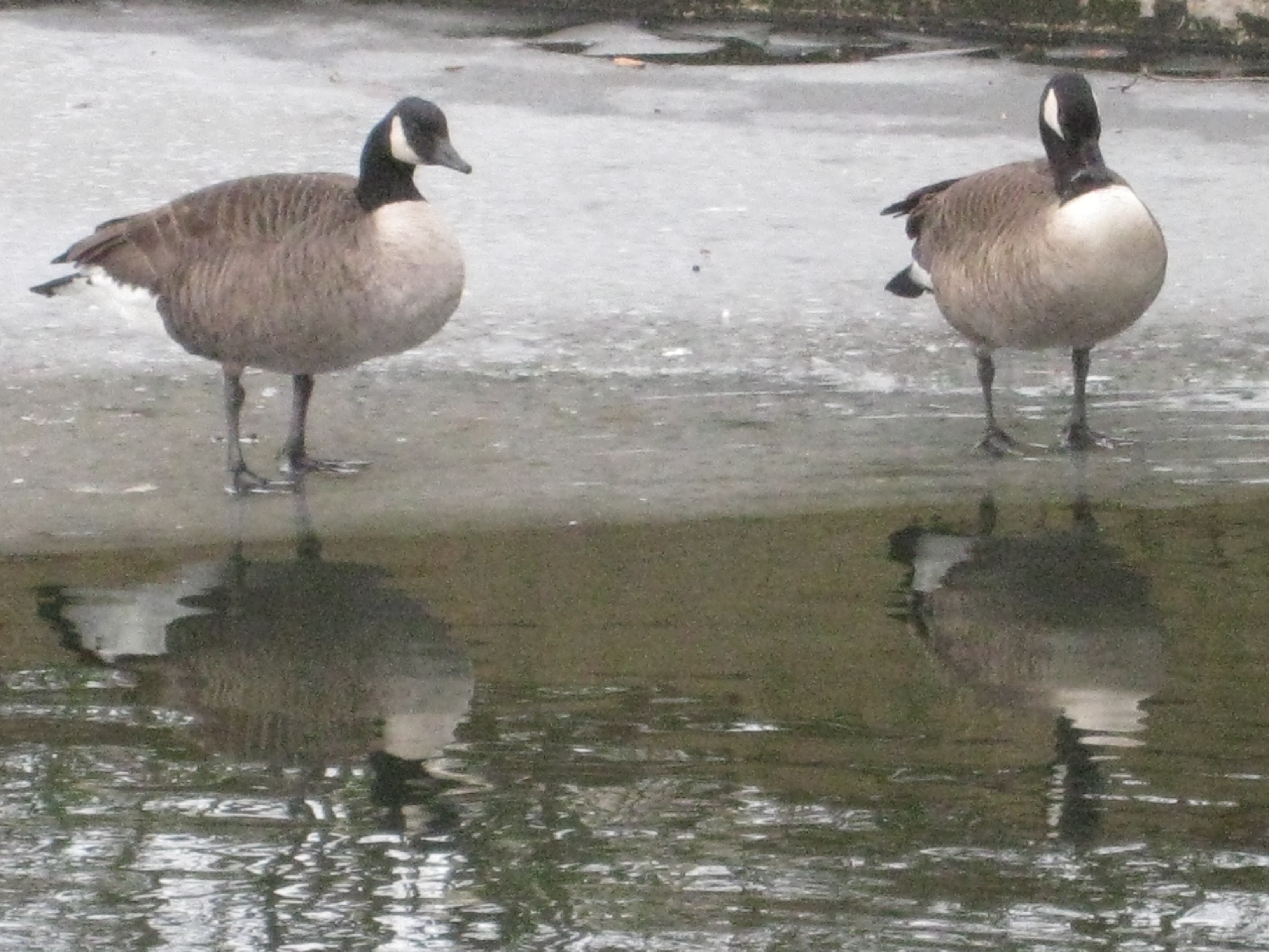 It was time to turn back. At Browning’s Pond the island’s usual population of Canada Geese were on the ice, preening themselves with the aid of watery reflections.
