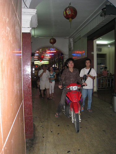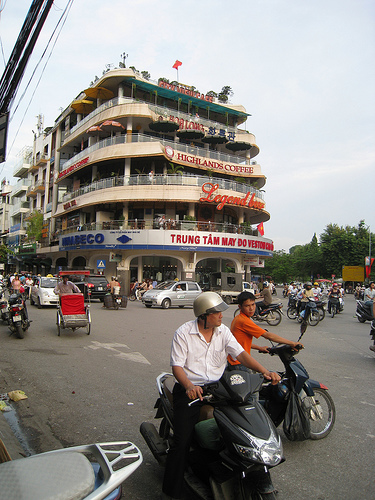 There weren’t many cars on the road; but it was positively teeming with two-wheeled vehicles, and from time to time we spotted a cart being towed along in the traffic by skinny oxen with horns that could do a lot of damage to a car windscreen, should push come to shove. As we drank in our new surrounds, it amazed us how many people could squeeze onto a tiny moped. Whole families, babies included, seemed able to fit on the one seat. Mopeds and motorcycles were the main form of transport here, carrying everything from people to bamboo cages filled with chickens or other animals destined for market or even the odd oven. If that weren’t a balancing act in itself, then the manoeuvres of the moped riders as they weaved daringly through the heavy traffic or drove out of side streets at right angles into the traffic flow without looking made them the equivalent of two-wheeled contortion artists. For these riders, no gap in the traffic was too small, and the air was alive with the honking of horns. This was one busy city and it was easy to think that it might just never slow down.