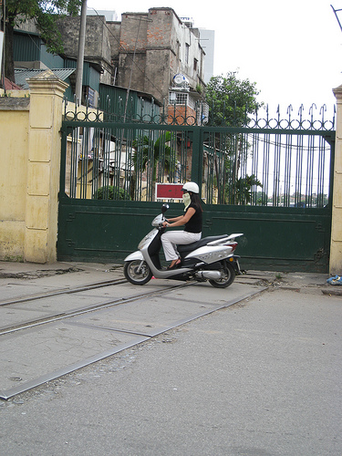 (Moped rider near the Temple of Literature in Hanoi. Many women wear bandannas to protect them against traffic fumes, but also to protect their skin from sun exposure. Light skin is beautiful skin in Vietnam.)