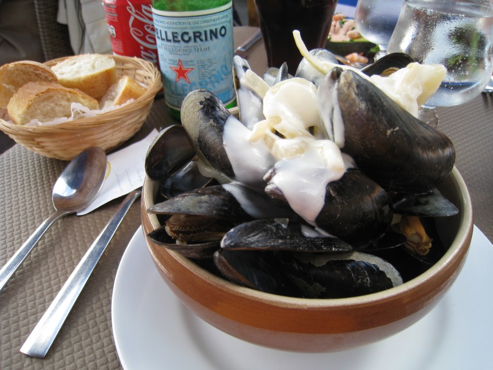 We took a table at a restaurant terrace overlooking the Bassin. Named Le Pêle Mêle, it had a number of different prix fixe options at different price points. We decided on the Menu Étape where for a mere €13.90 a head, Monsieur and I could enjoy two fabulous courses of true Norman food. Monsieur enjoyed his starter of avocado filled with creamy little prawns. Simple, yet fresh and attractive in presentation but gone in a flash of famished Frenchman with fork. I had chosen moules (mussels) with cream, and not just any cream – NORMAN cream, of course. “Normandy’s known for its cream,” mumbled Monsieur between mouthfuls of crevettes. I could see why. The mussels had been simmered with onion and something vaguely apple-ish (cider, perhaps?) before arriving with a generous dollop of cream atop their black shells. The cream melted into the mussel juice, making a delicious soup to slurp at the end of mussel-munching. When I was done, empty shells were all that remained.