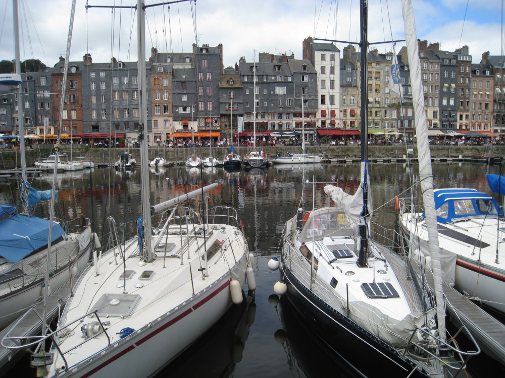 Many of the shops had windows filled with bottles of cider and Calvados, pommeau (a  cider-Calvados hybrid) and poiré (a pear liqueur). Souvenirs abounded, including little pottery bowls painted with popular French Christian names, tins of Norman biscuits and model lighthouse lamps. We pushed on, through Place Sainte Cathérine with the oldest wooden church in France, now barely visible thanks to the myriad market stalls and crush of Saturday shoppers, back to the inner port, where a flotilla of fine yachts rested in the Vieux Bassin. It will come as no surprise to some of you that Monsieur and I were now ready for lunch.