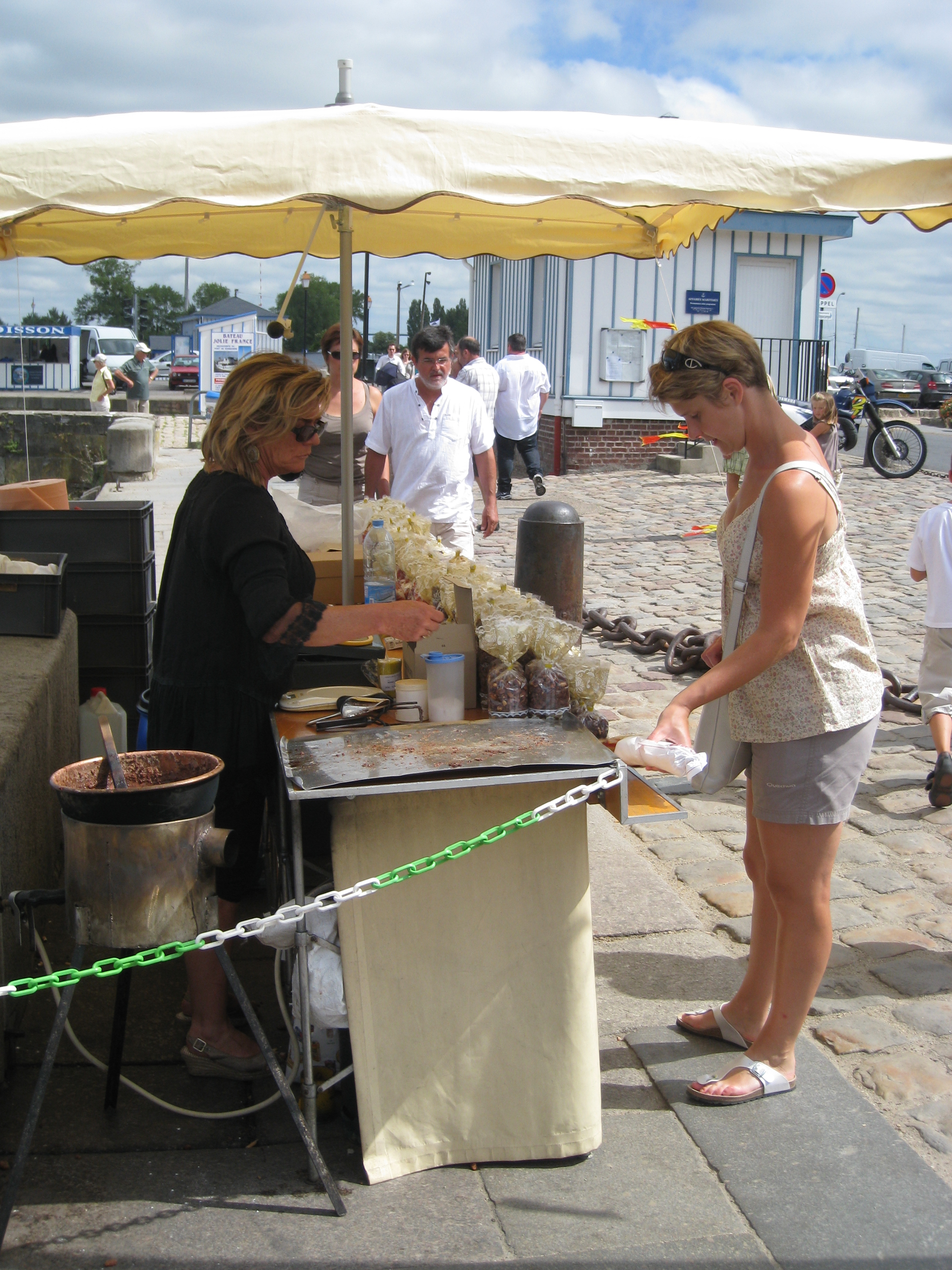 Monsieur and I visited Honfleur one Saturday in August, and as happens all over France on Saturdays, the market was in town. We crossed a little bridge made from ancient wooden planks and in doing so passed a strange pair – mother and son presumably, both with matted hair and wild eyes, she in big skirts an he in rumpled, falling-down jeans that looked in need of a good, long soak. They were walking in vague circles, staring at the pedestrian traffic across the bridge with dark eyes that seemed to say ‘interlopers! Leave our town.’