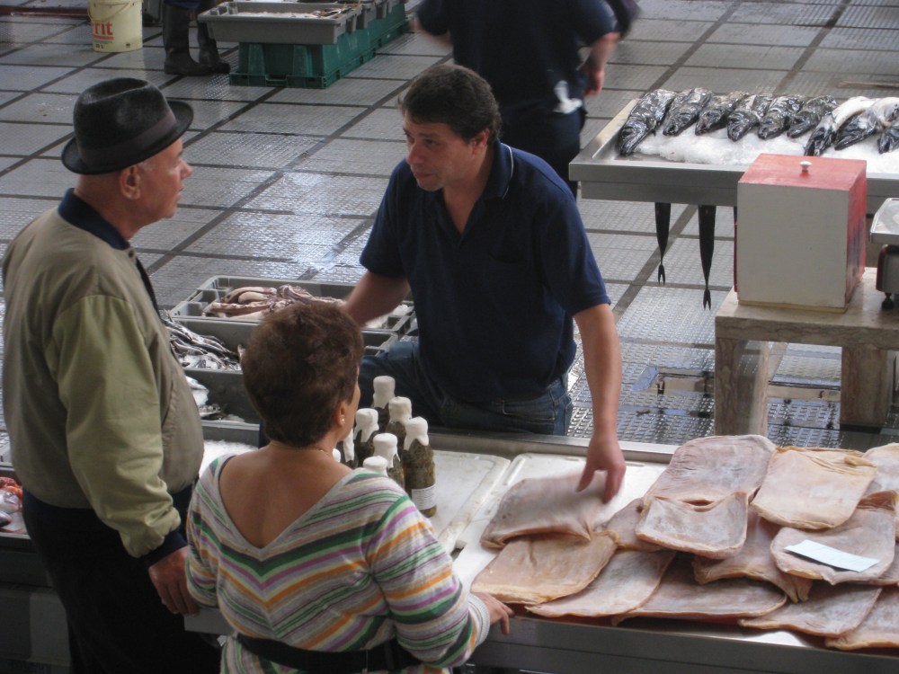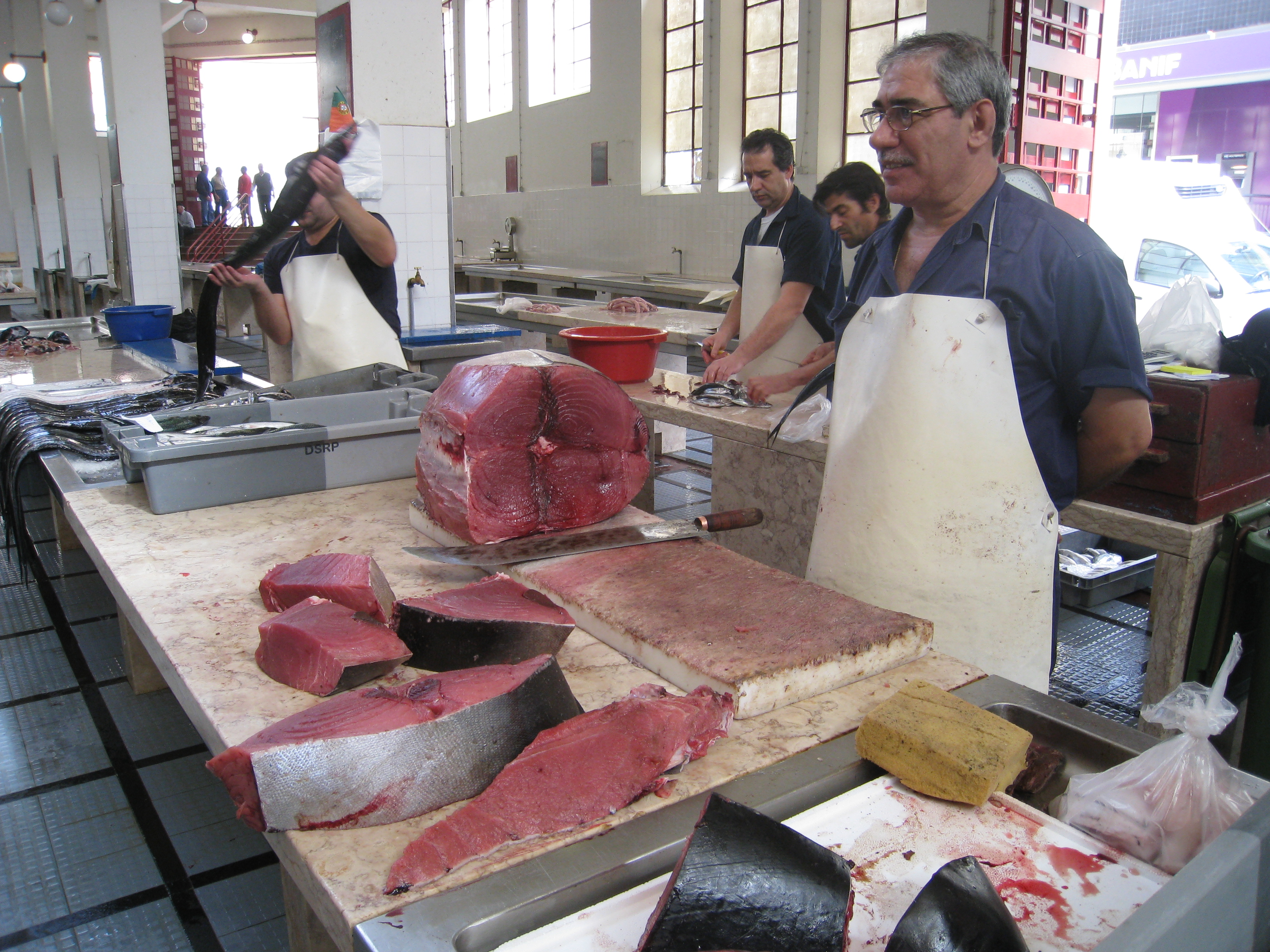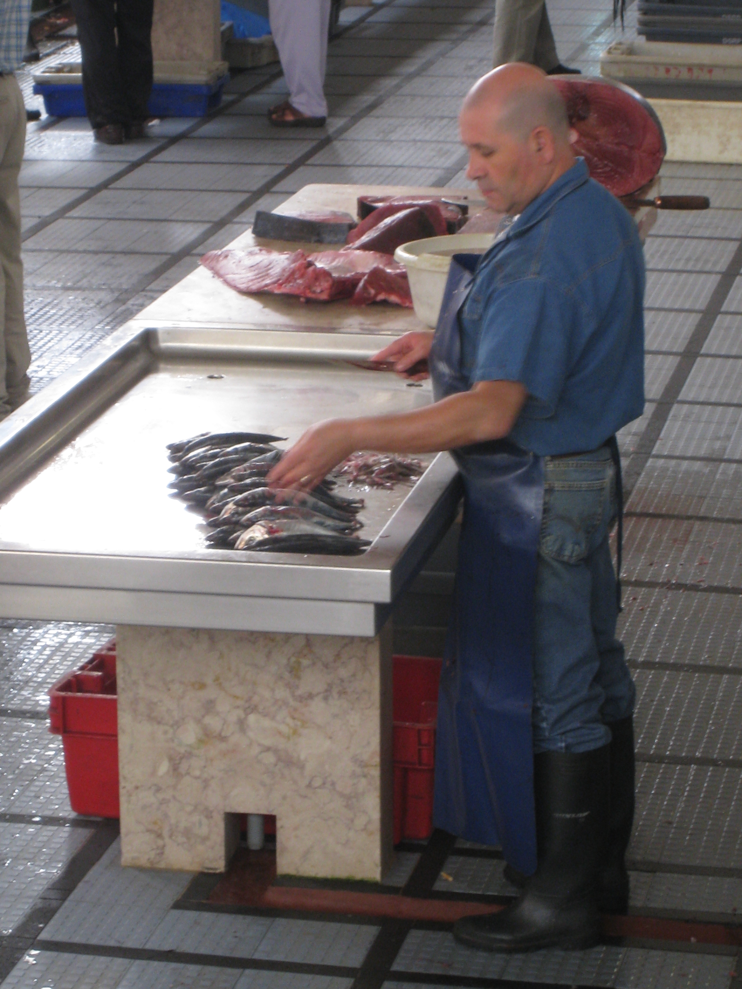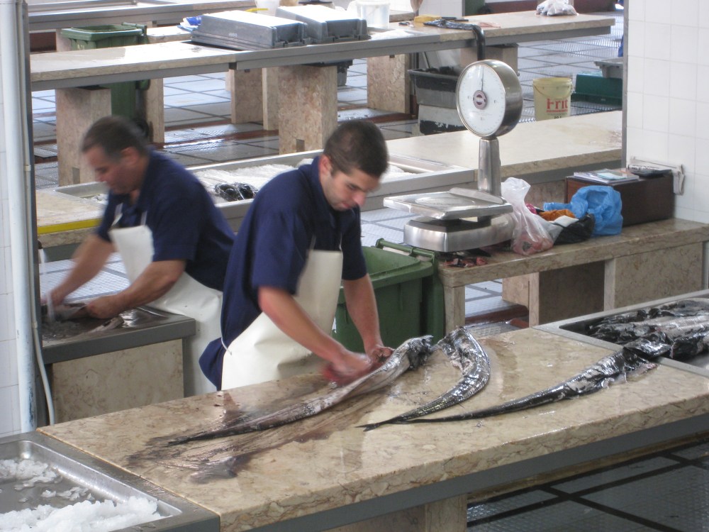 Monsieur and I were fresh off the plane from Lisbon when we found Funchal Market. It was lunchtime so activity, which had started at daybreak, was starting to wind down, but the fish market was still quite busy. Most of the marble preparation areas were loaded up with long, black, headless fish that looked a bit like eels. I later found out their name: scabbard fish.