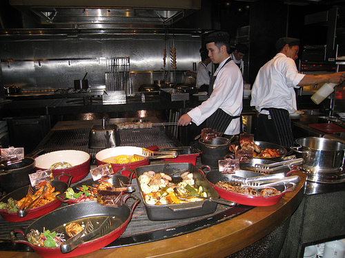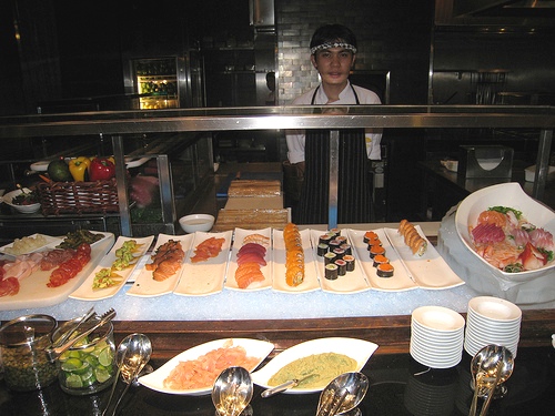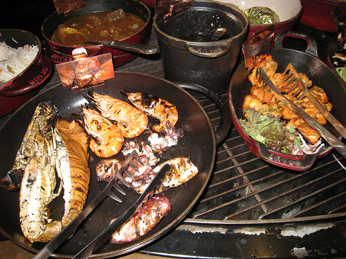 Where the cocktails were a disappointment, and had now been replaced by the far more reliable Tiger beer, the buffet more than made up for lost brownie points in its range and quality. It was almost impossible to know where to start; the bread alone must have come in at least a dozen varieties. There was a Tandoori oven, kebab station, a Japanese Teppanyaki chef and separate sushi and sashimi bar. A rotisserie was in full operation over open fire and barbecue meats were available for all those with a carnivorous fang or two. For those with the desire to dine light, there sat bowl after bowl of salad, from simple tossed greenery to those with a more Asiatic influence, noodle salads, seafood with chilli and beansprouts, something to tickle a great many palates.