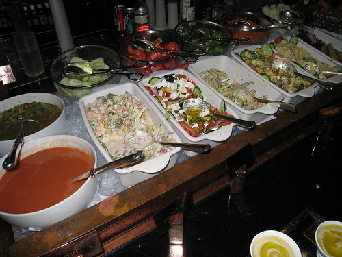 Elsewhere, I discovered wisdom in the provision of cool gazpacho, ready to ladle with all the optional condiments lined up in adjacent bowls. Of utmost relevance to this keen pescetarian, the seafood selection was vast, with grilled King prawns so Jabba the Hut-fat that just one would take care of any starter requirement, succulent chunks of octopus, and juicy blue river lobster.