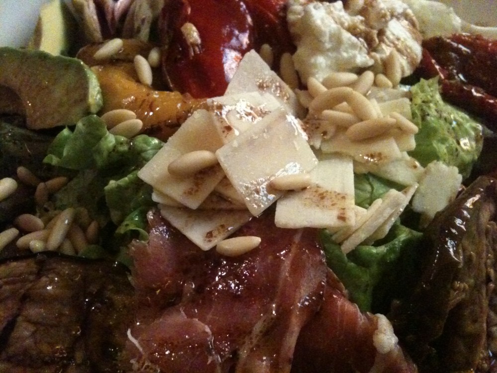 A pillow of crisp, green leaves peeped up at us from beneath a panoply of colours and textures. Folds of paper-thin prosciutto, wedges of avocado pear, grilled rounds of marshmallowy eggplant and a rainbow of marinated capsicum – just looking at the array made me think of Arcimboldo, the artist who invented the vegetable-face portrait. A dollop of creamy ricotta sat on one side of the plate, artichokes hid beneath greenery on the other. It’s not possible to assemble an Italian salad without tomatoes, so they were there, too. A mosaic of slim, hard cheese (parmesan? pecorino?) squares sat  like a tumble of upturned scrabble squares atop all, a shower of pinenuts and balsamic vinegar completing the composition.