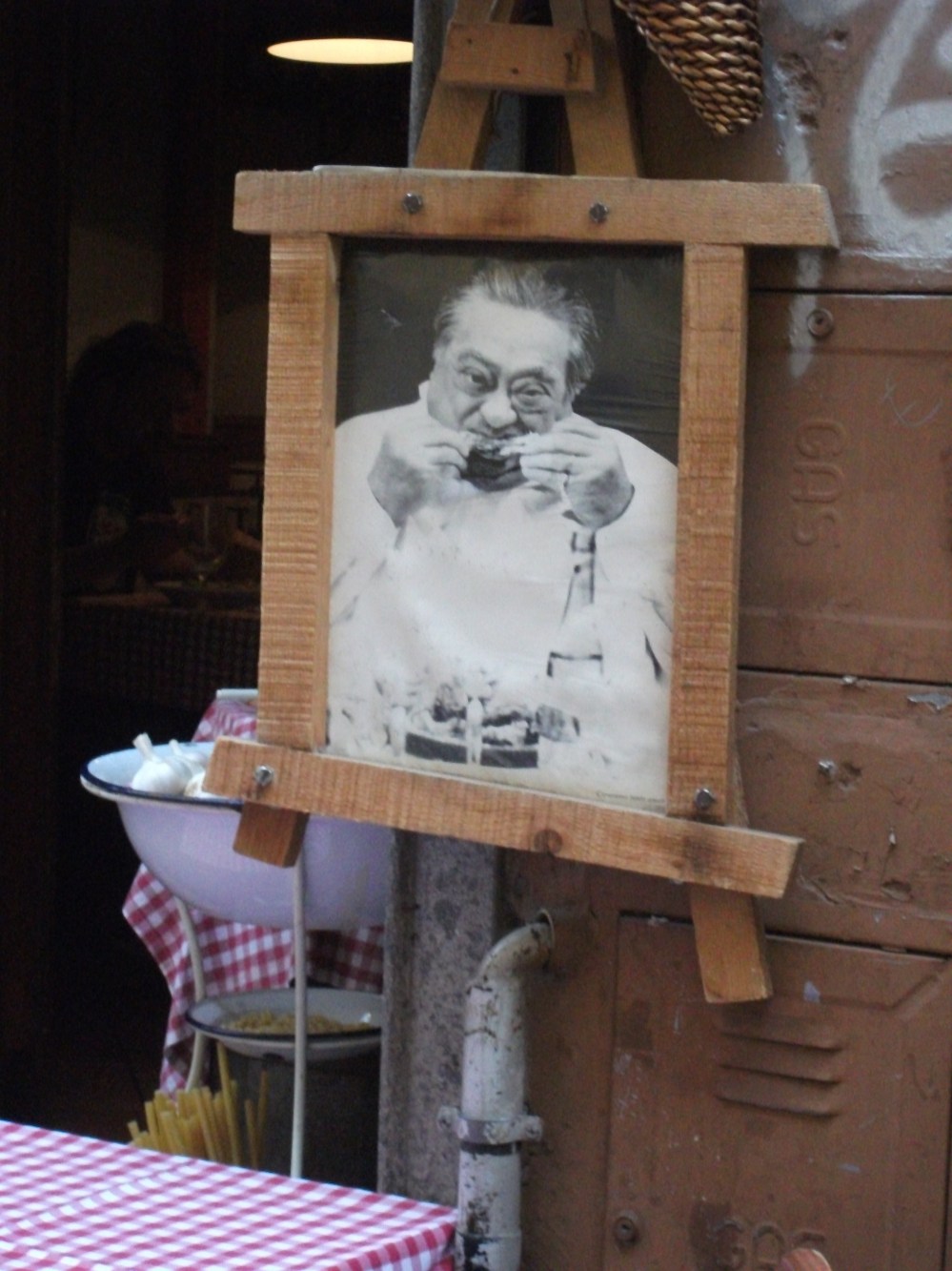 Monsieur and I laughed out loud at the overt gluttony of this image, posted outside a restaurant on one of Trastevere’s busiest restaurant streets. What was his purpose, we wondered, to encourage eating or dieting?