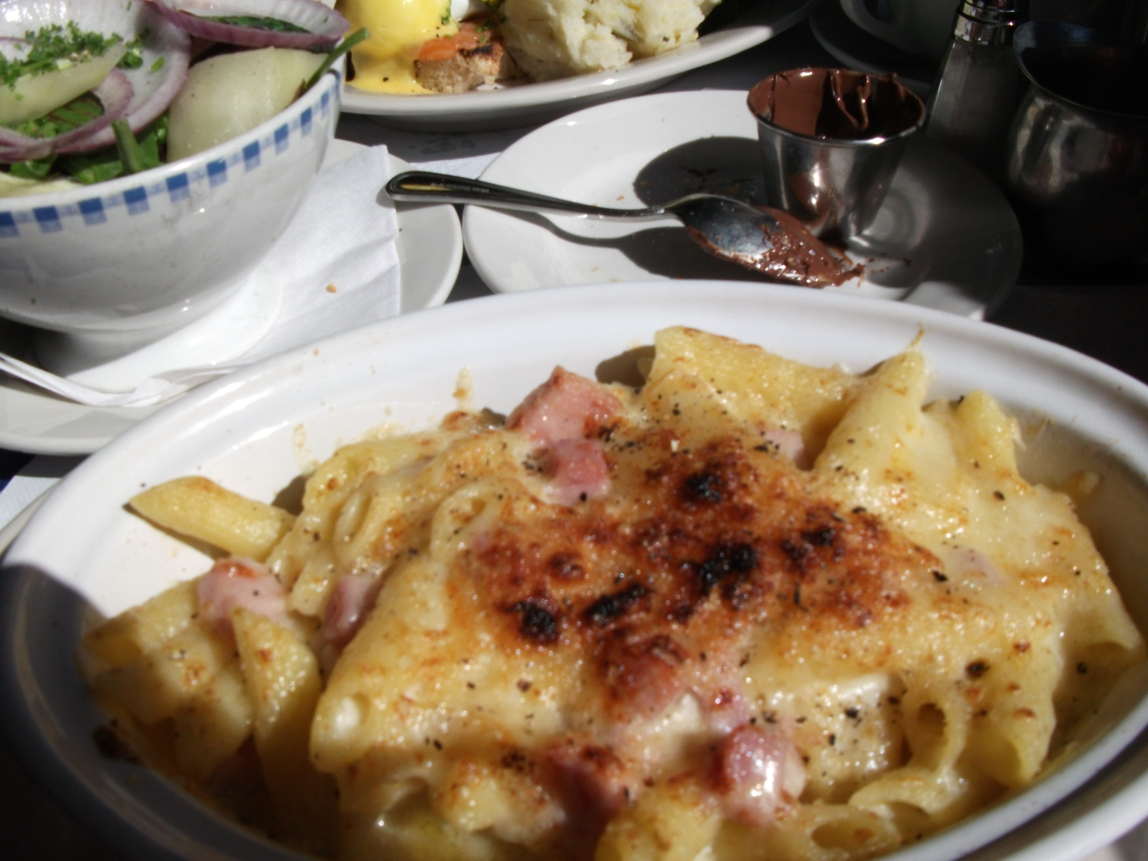 Around us, the meal of choice seemed to be the waffle special, loaded with blueberries, strawberries and rounds of fresh kiwifruit, all scattered atop an evil layer of whipped cream. This was obviously not the place for slimmers, as proven by a quick glance at the menu which features a lot of eggs, potatoes, burgers and cheese. With such a tempting selection I was torn; would I honour my penchant for croquettes (North Sea shrimp or Belgian Cheese), cave in to an Omelette Maison (smoked salmon, scallions and sour cream) or tuck into the vol au vent filled with chicken stew, bacon, mushrooms and accompanied by fries? In the end I decided to go all out on the calorie front, ordering the Macaroni Jambon-Fromage – traditional mac ‘n’cheese with ham and Gruyère, delightfully gooey and rich with melted dairy products. Then to assuage the guilt attached to the glutton I am fully capable of being, I ordered a side salad of leaves with sliced red onion, seedless cucumber chunks and divinely marinated tomato that’s reminiscent of how tomatoey a tomato should taste. All of the time.