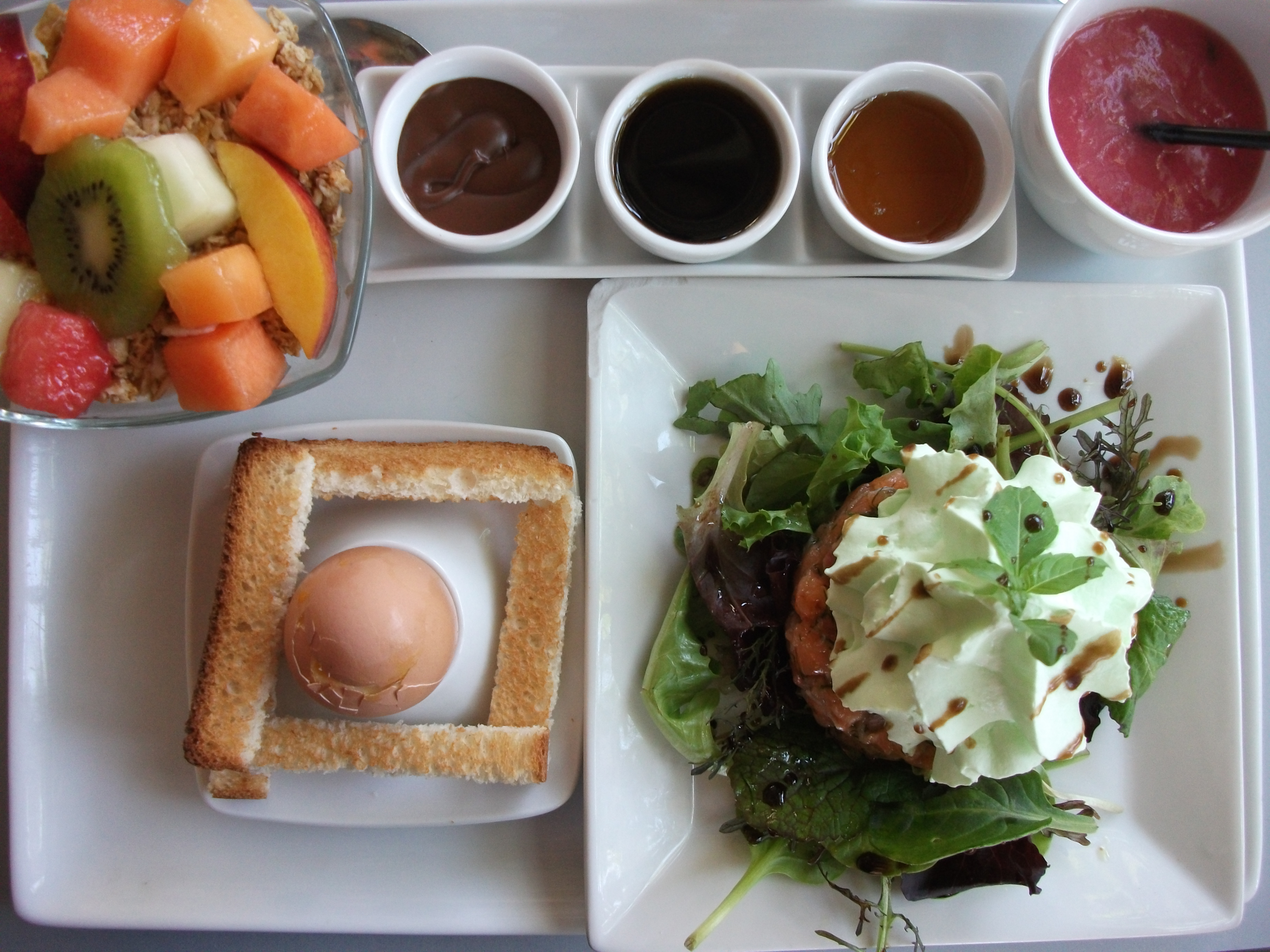 Here we have the muesli with fromage blanc, topped with fresh fruit salad, a smart little tray of nutella, maple syrup and a honey (for the pancakes), a delicious mixed-fruit smoothie that magically appeared in addition to our hot drinks and juices, smoked salmon tartare topped with a delicious but superfluous mint chantilly and the classic boiled egg with soldiers.