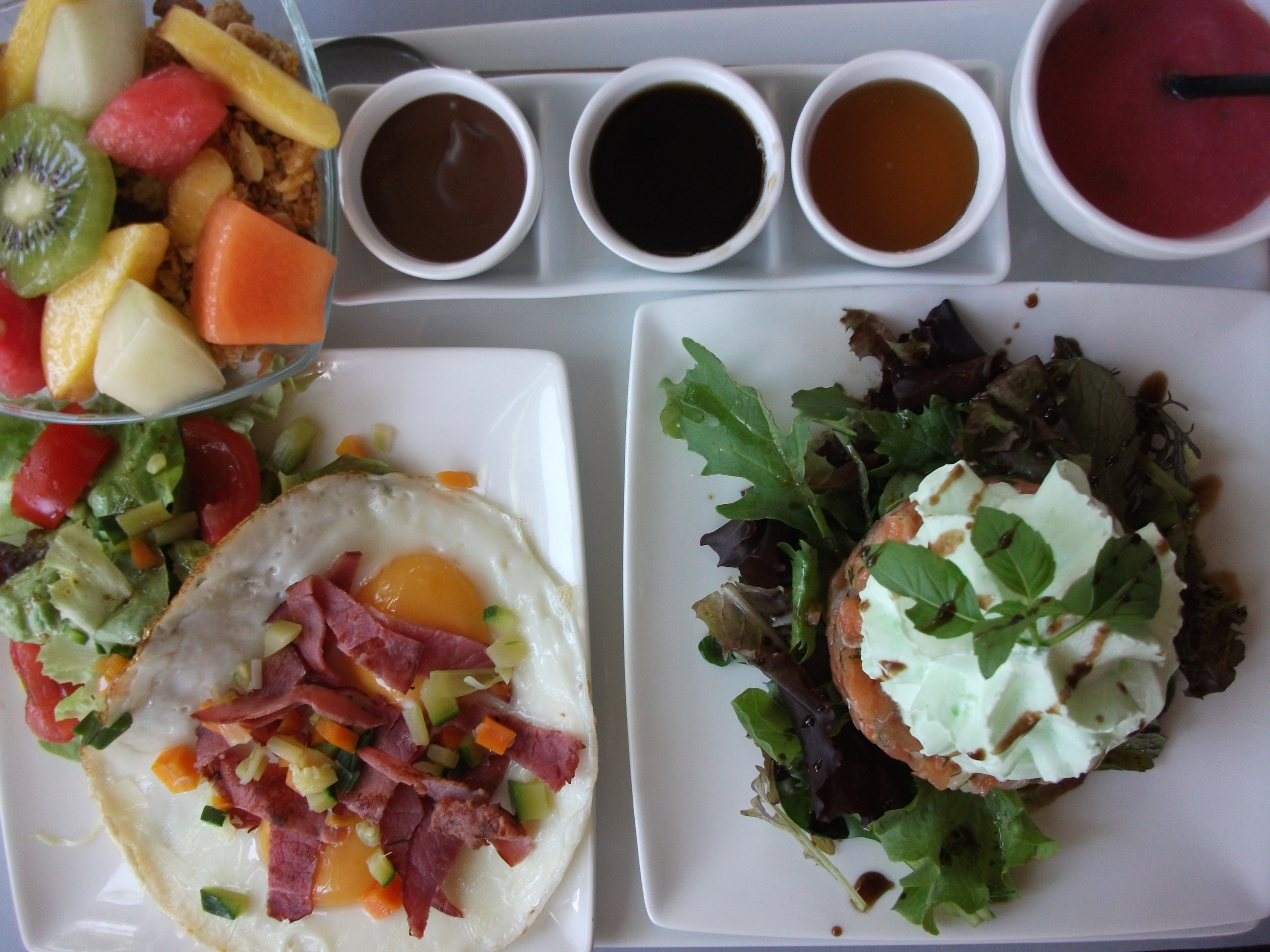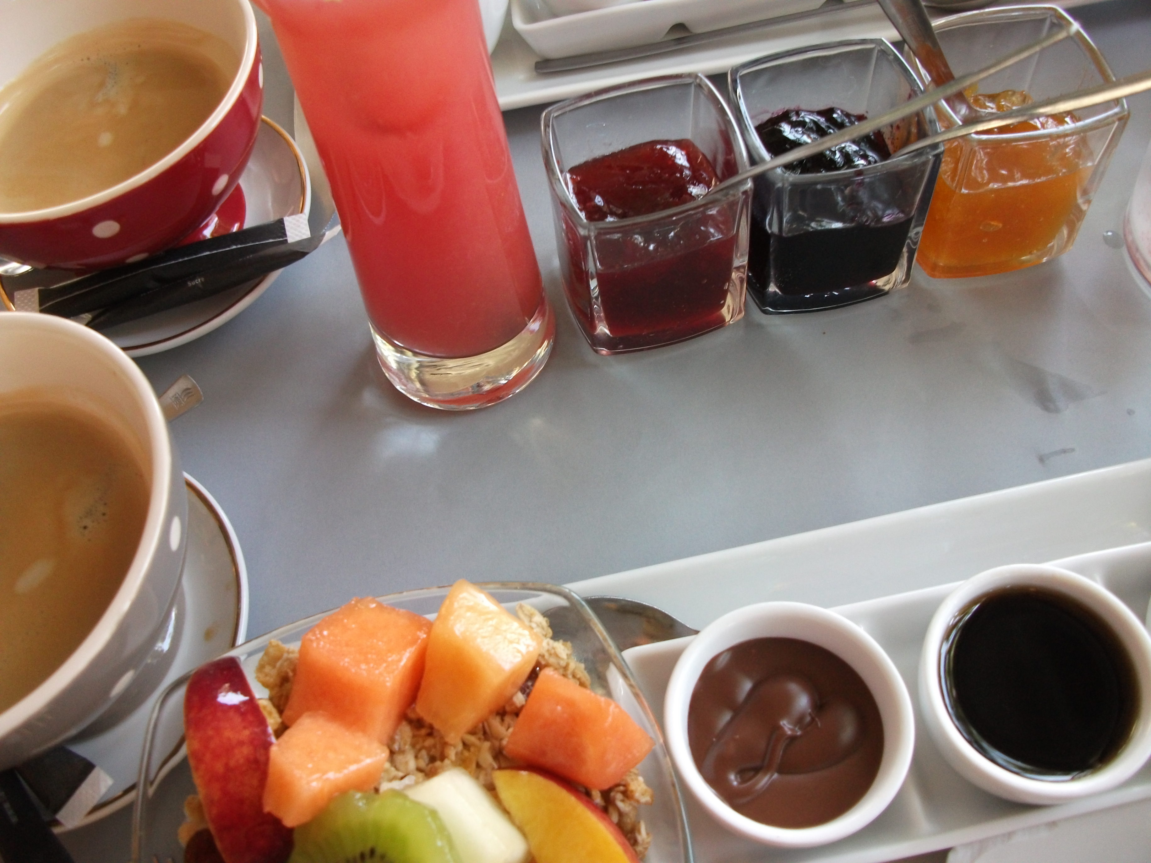 The coffee came in generous boules, the grapefruit juice tasted freshly-squeezed, and in case Nutella, syrup and honey didn’t provide enough choice with which to slather your morning pancakes and tartines, also provided were two jams and a marmalade in a trio of glass verrines.