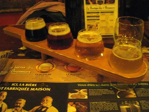 I’m a girl for whom menus often bring on a decision-making crisis, so on this occasion I was grateful that the sometimes challenging act of deciding what to imbibe was taken out of my hands. Monsieur and his mother ordered us each a tasting rack of house brews; ’tis the thing to do at Les Trois Brasseurs, apparently.