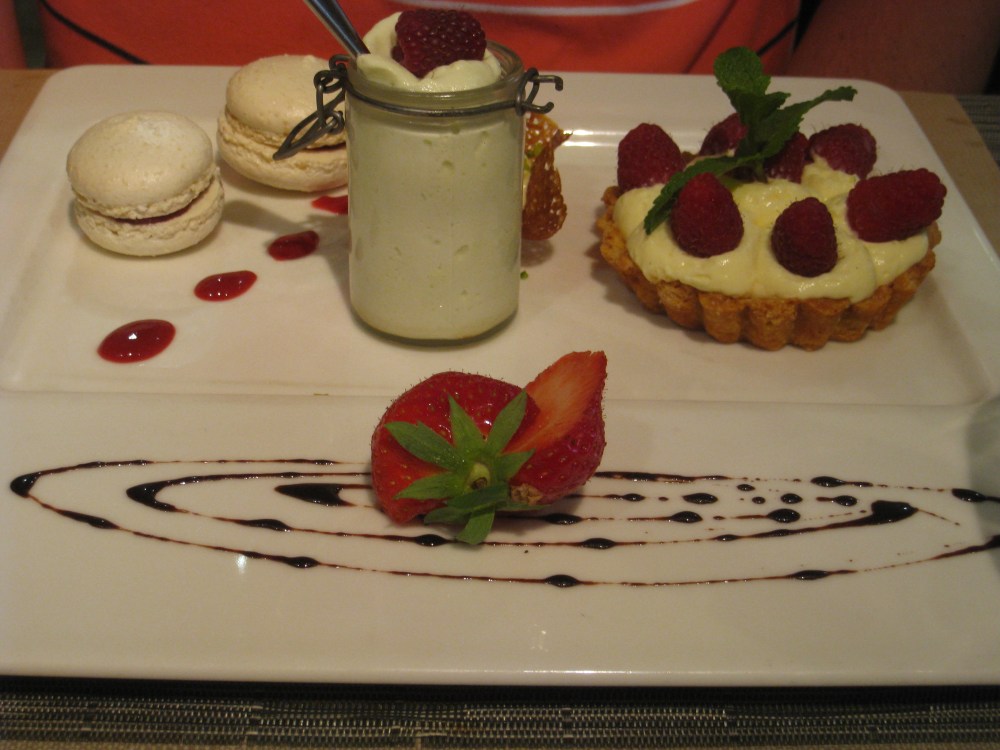 For once, my husband draws a lucky card: his thus-far frustrated palate will now be soothed by a perfect round of raspberry tart, fresh strawberries, berry-flavoured macarons, a berry-filled brandy snap basket and (wait, there’s more) a small preserving jar oozing with mint-flavoured chantilly, topped with a raspberry.