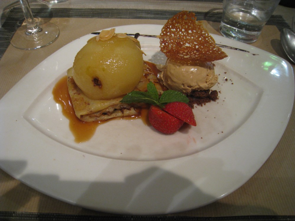 The dessert course is now under pressure to perform. My fingers cross and remain quite paralysed until a pair of beautiful sweet plates are set before us. Once more, my fortune holds and before me is a pile of goodness – a steaming Breton crêpe, crowned with a stewed whole pear, all sticky and soaking with a subtle, walnut butter sauce.