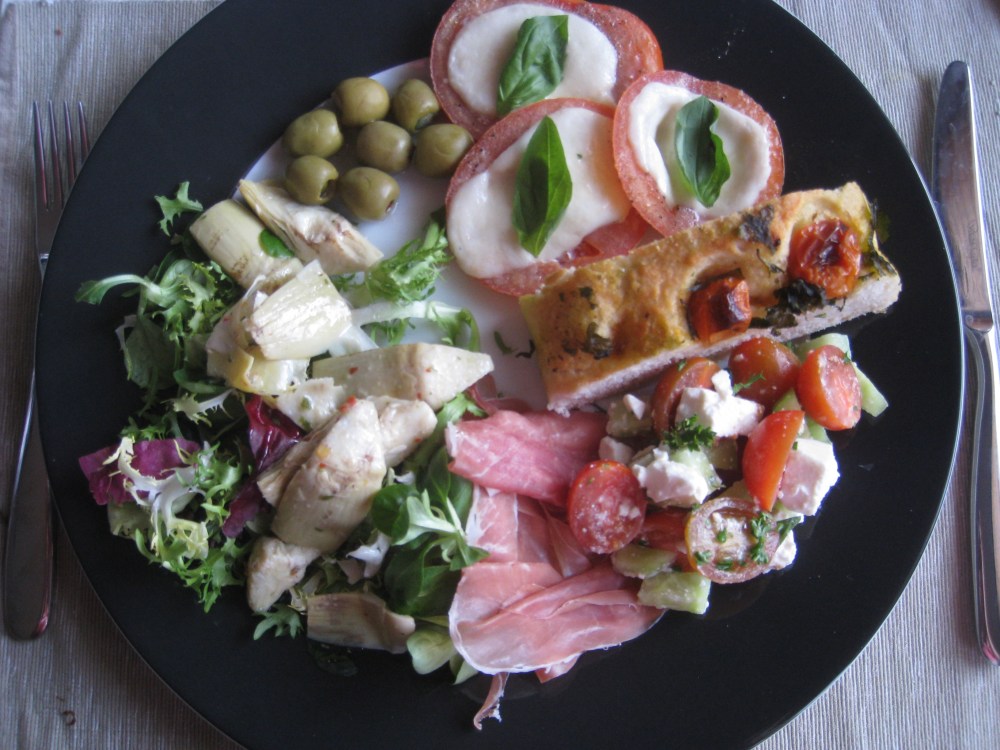 Fill a bowl with cherry tomatoes cut in half, cubes of feta cheese, plenty of chopped parsley, a drizzle of olive oil and lemon juice to taste. Toss and spoon onto your plate. Leftovers can be added to another meal later. Put slices of mozzarella onto slices of beef tomato, season and heat in the oven until just melted (just a few minutes at 150C). Add a few of these to the plate and garnish each with a basil leaf. That’s the hard part. Now just add anything vaguely Mediterranean you might have to your lunch: slices of prosciutto or salami, a handful of olives, some lettuce leaves topped with emergency artichokes (from the jar that dwells in the pantry) – their preserving juice creates an immediate dressing so no vinaigrette-concocting required.