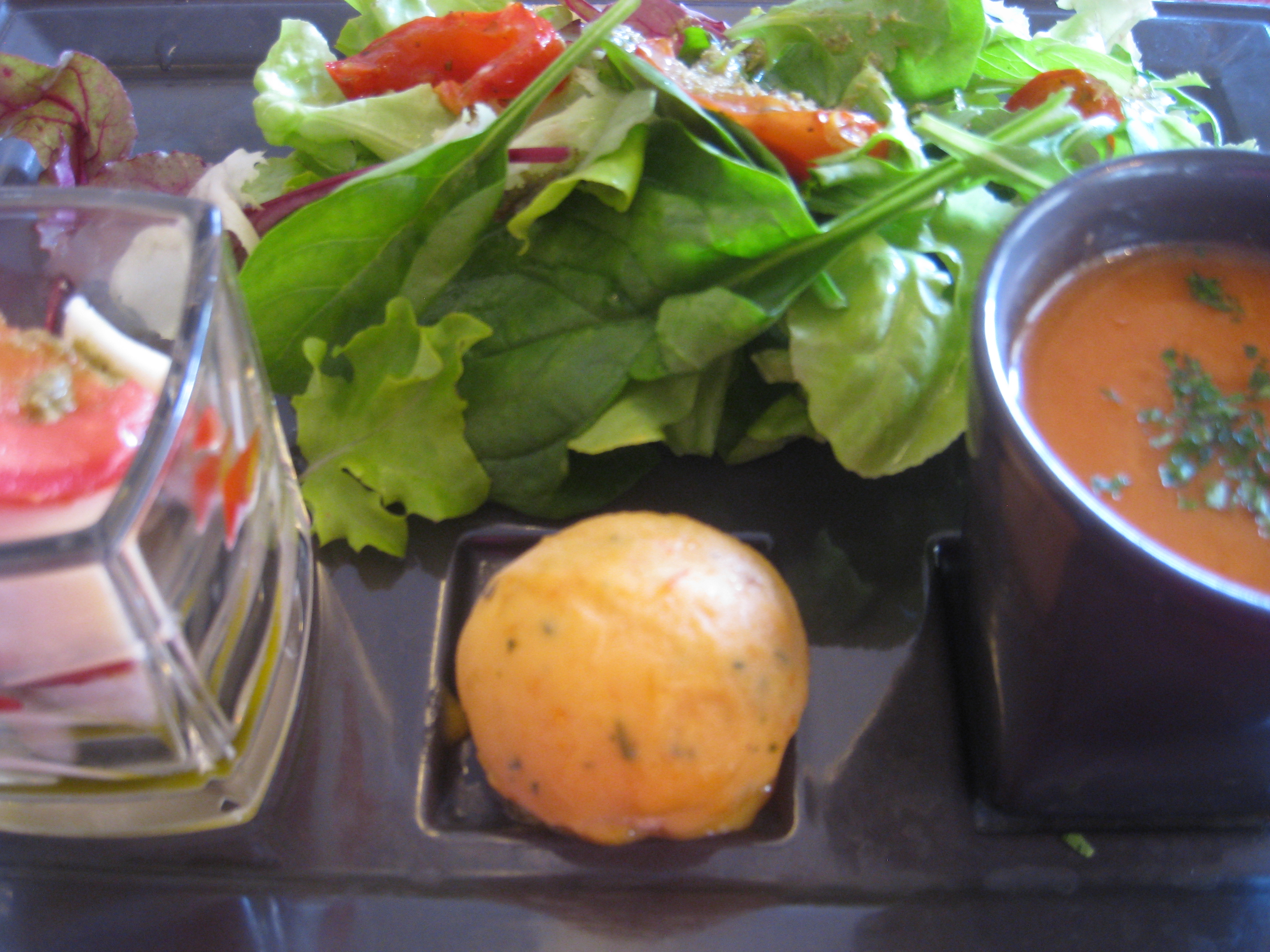 And so, to the food. As anyone knows, pushing a buggy to the top of a steep-ish hill requires a full three-course lunch, so Monsieur and I dug into a set menu each. After an amuse bouche of loosely-bound fish pâté (I’d like to say mackerel here) with golden croutons of baguette, my lunch started with La Trilogie de Tomate: a tomato-lover’s guilty pleasure featuring a verrine of gazpacho, another of layered tomato and mozzarella salad and a ball of tomato and basil sorbet. Everything was artfully arranged on a rectangular platter, with a generous garnish of green salad. All good, true flavours, in total contrast to the glut of tasteless toms on the market of recent times. What a relief to eat red fruit that tasted as it should – like tomatoes, instead of watery cardboard stuffed into a tomato-skinned shell! I was particularly impressed by the sorbet, where the tang of basil sang its own, distinct tune whilst retaining its function as the classic sidekick to tomato.