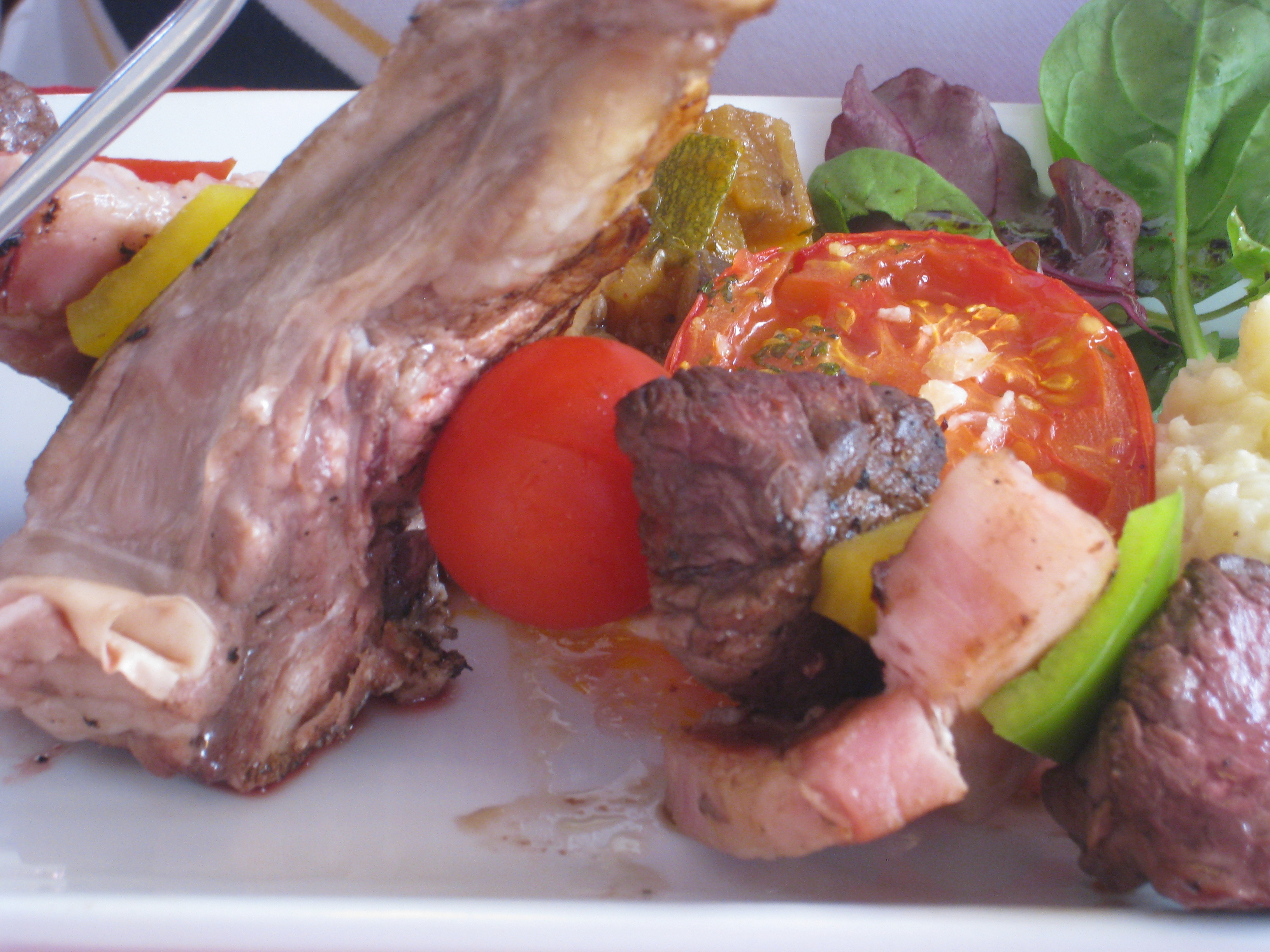 Monsieur’s Menu Découverte consisted of fresh salmon tartare, a mixed grill brochette with choice of sauce and a café gourmand, all for the grand total of €23.90. Other starter options for this menu included a classic south western duck salad (breast, giblets, foie gras all featured), a terrine of Pont l’Eveque cheese with grilled chicken breast, or a scallop and mushroom pastry. For the mains there’s a faux filet, pork shank with cider cream sauce, monkfish with fresh mango salsa and the desserts list boasts everything that appears on the café gourmand plate with a couple of extras, so if you like to taste a bit of everything, the café gourmand is probably your best bet.