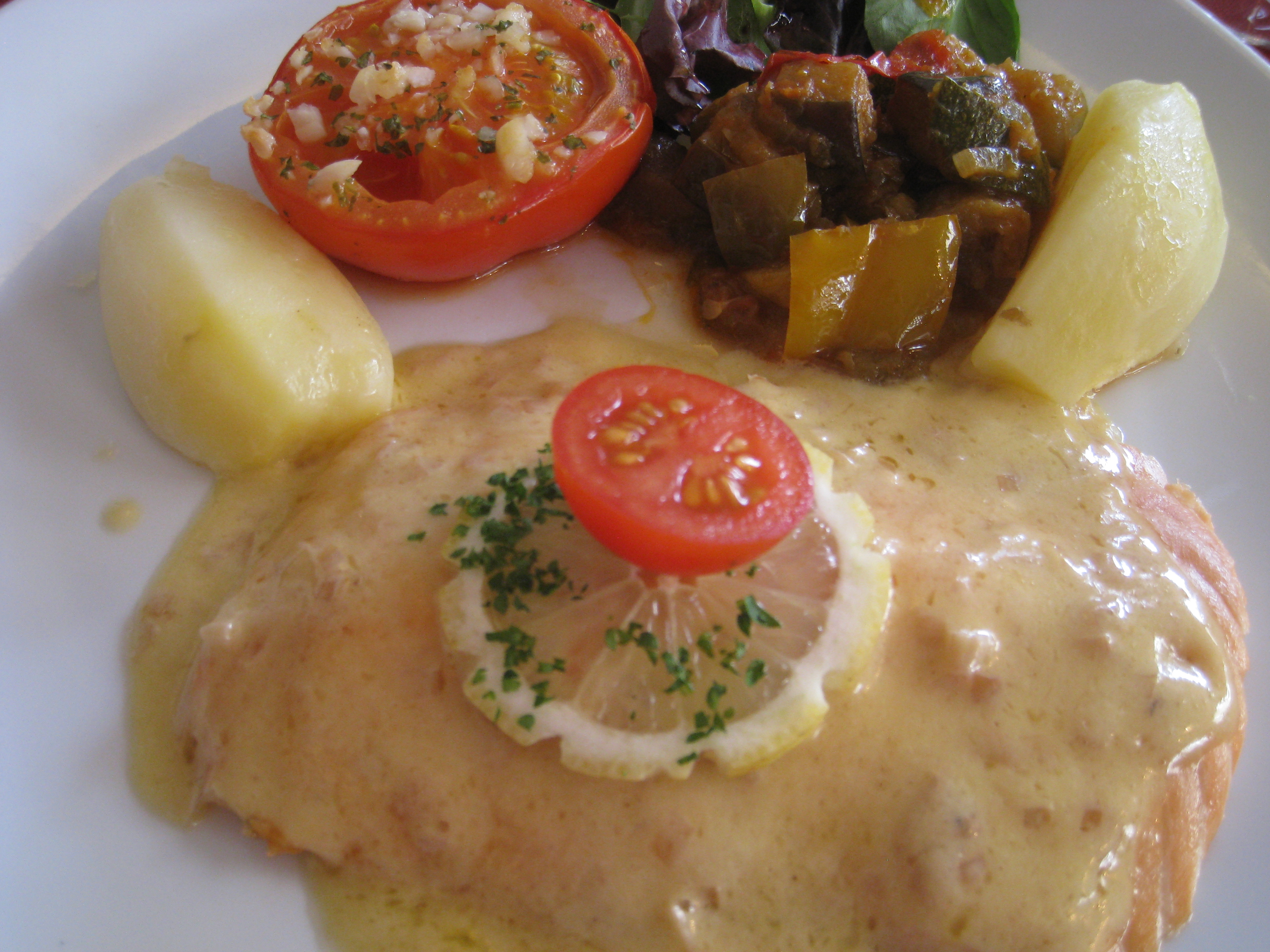 Some might say that my main course of escalope of salmon with a buerre blanc was relatively boring to behold in comparison to the above dishes, but beauty is in the eye of the beholder and this beholder says that the Coupe d’Or’s salmon practically rocked off its plate. Yes, it was a classic dish, sans twist, but ah, how wonderful it can be to enjoy such a staid performer when it’s done perfectly. The sauce was a delight, imbuing the salmon with life, even if it did look a bit anaemic from a distance. To be fair, any butter-based sauce looks like it needs a course of iron tablets if not off-set by a little colour and, in this case, the colour wasn’t coming from the star of the show, the salmon, but from the supporting act: tomatoes. The retro lemon slice and cherry tomato garnish was really just designed to interrupt the pallor of the sauce-soaked fish but the larger half tomato accompaniment was heftily, yet not overpoweringly seasoned with garlic and herbes de Provence. Meanwhile its texture was soft and warm and welcoming, much like the service. Without it, the plate might have looked like a perfectly-coiffed Parisienne of a certain age caught without her lippy, yet combined with the dollop of ratatouille and a pair of silky spuds that spoke of being steeped in a light stock, the veg not only lifted the appearance of the dish, but combined to create a successfully savoury sideshow. This is an unpretentious plate that I could eat over and over again. No need for foams or liquid nitrogen or gold leaf adornment. This dish could win a round on MasterChef simply because it is executed properly and, as the French put it, is bien dans sa peau (comfortable in itself). It knows what it is and isn’t afraid to just BE.