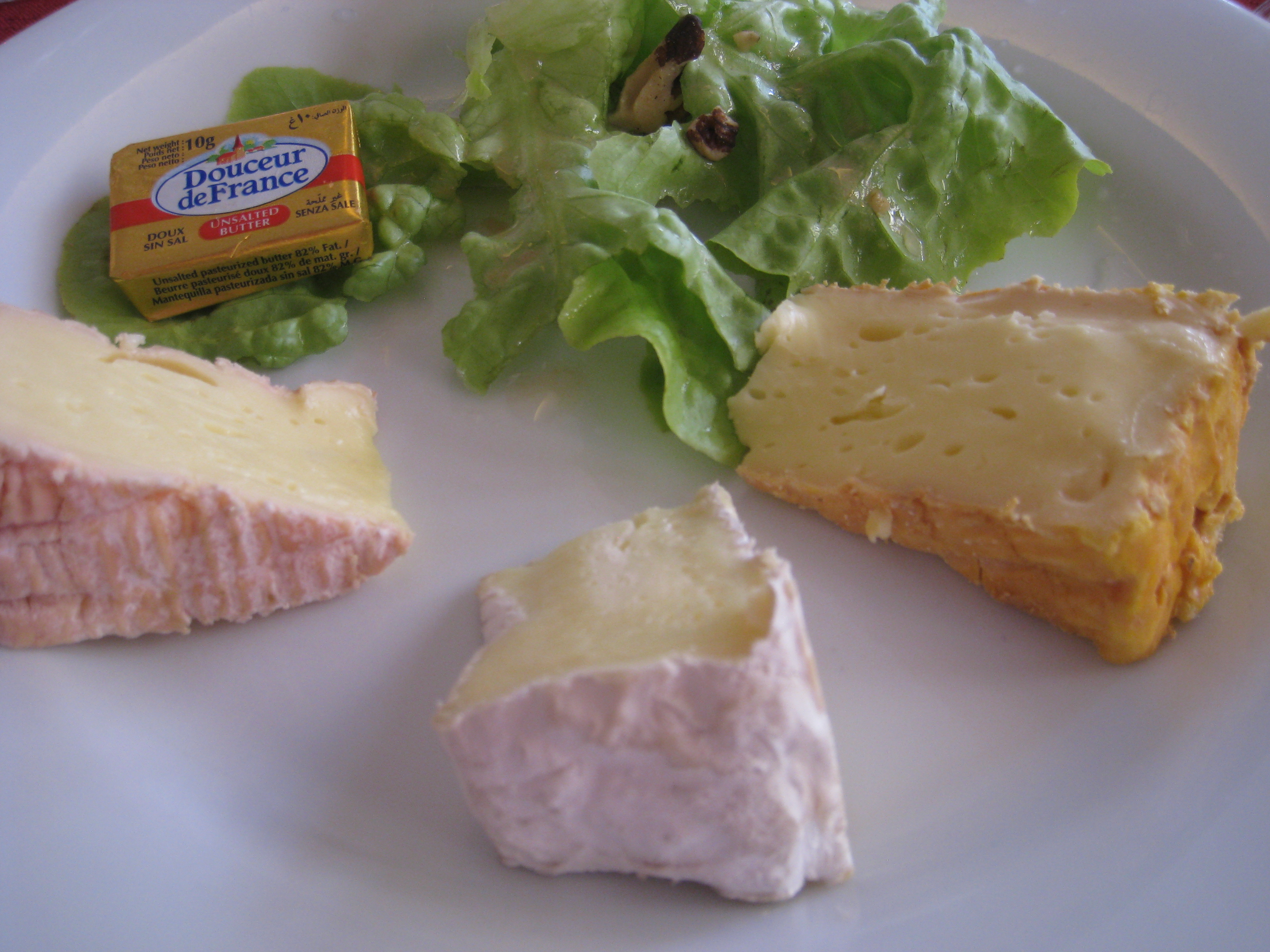 Enter the cheese! Once more the glutton’s paradise of the Pays d’Auge was the producer responsible for the three varieties set down before me: wedges of Pont l’Eveque, Camembert and Livarot, all creamy, with varying intensity and, shall we say, fragrance? The salad was an exercise in simplicity and reduction of size without the loss of flavour: crisp, sweet lettuce, the crunch of bitter walnut, appropriately dressed for its size with just the right amount of home-made vinaigrette. Mrs Savoury and Mr Sweet were very happy campers, fully refuelled and ready for their hike to the basilica, baby and buggy in tow.