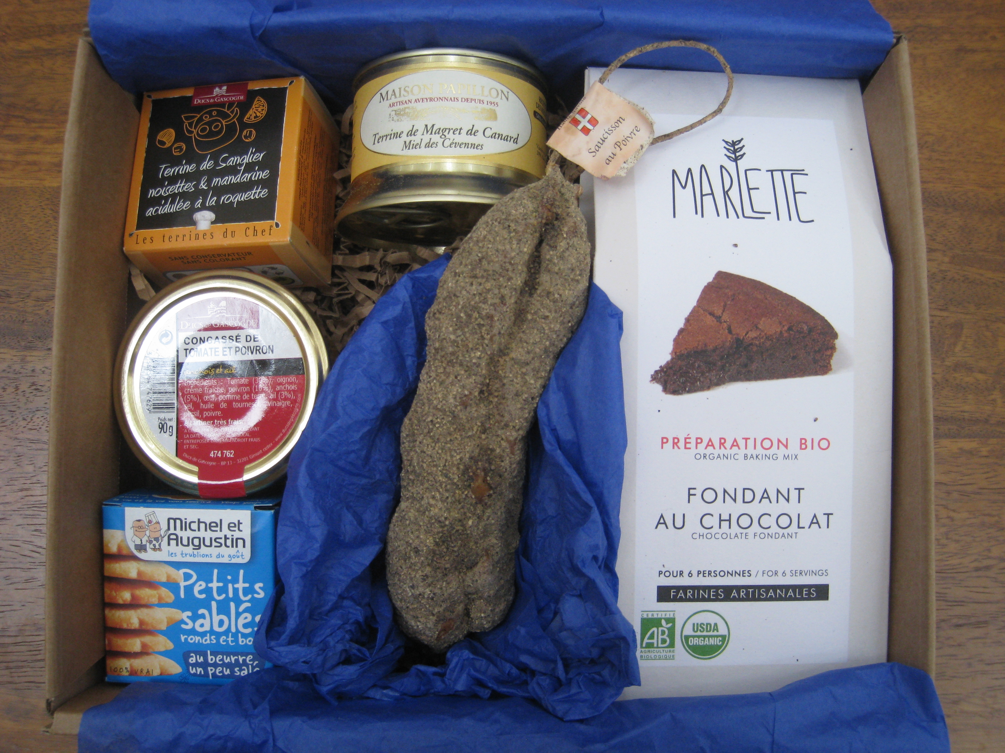 When my box arrived, I was jiggling with excitement because I had no idea what might be inside. After carefully opening it I found that everything was safely wrapped in shredded paper with vibrant blue tissue and nothing was included that could have either broken or perished en route. The product sizes allow just enough for a taster or two for two people, although the pudding mix caters for up to six people. That works, though, because you wouldn’t serve the pudding with the apéritif; it’s really just a sweet extra to round off the box and give the glutton another occasion to sit down with French food, and a digestif, perhaps, at the other end of a meal?