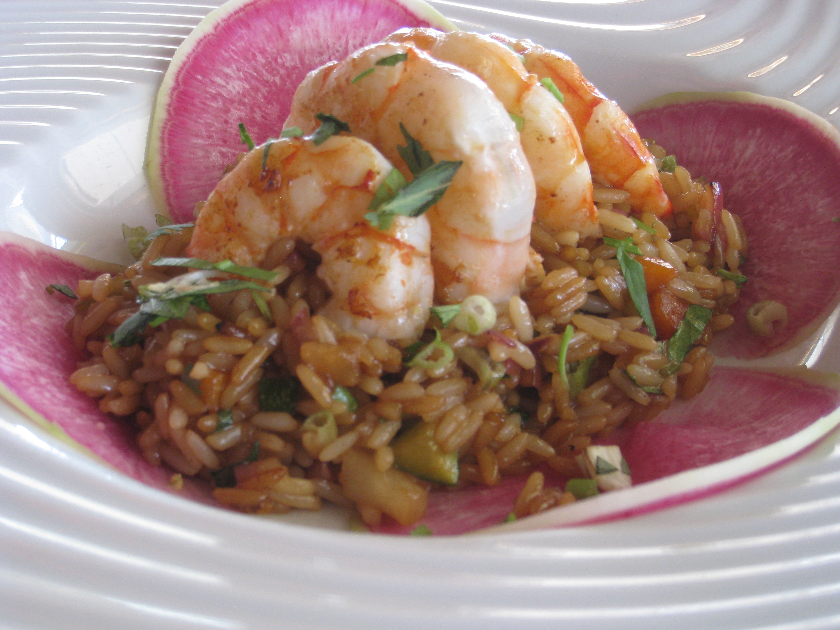 Monsieur ordered a stir fry of rice with King Prawns, which he pronounced ‘excellent’; this is praise indeed from a particularly particular eater. It arrived atop giant petals of watermelon radish – at once arresting on the plate, but also cooling against the spice of this dish.