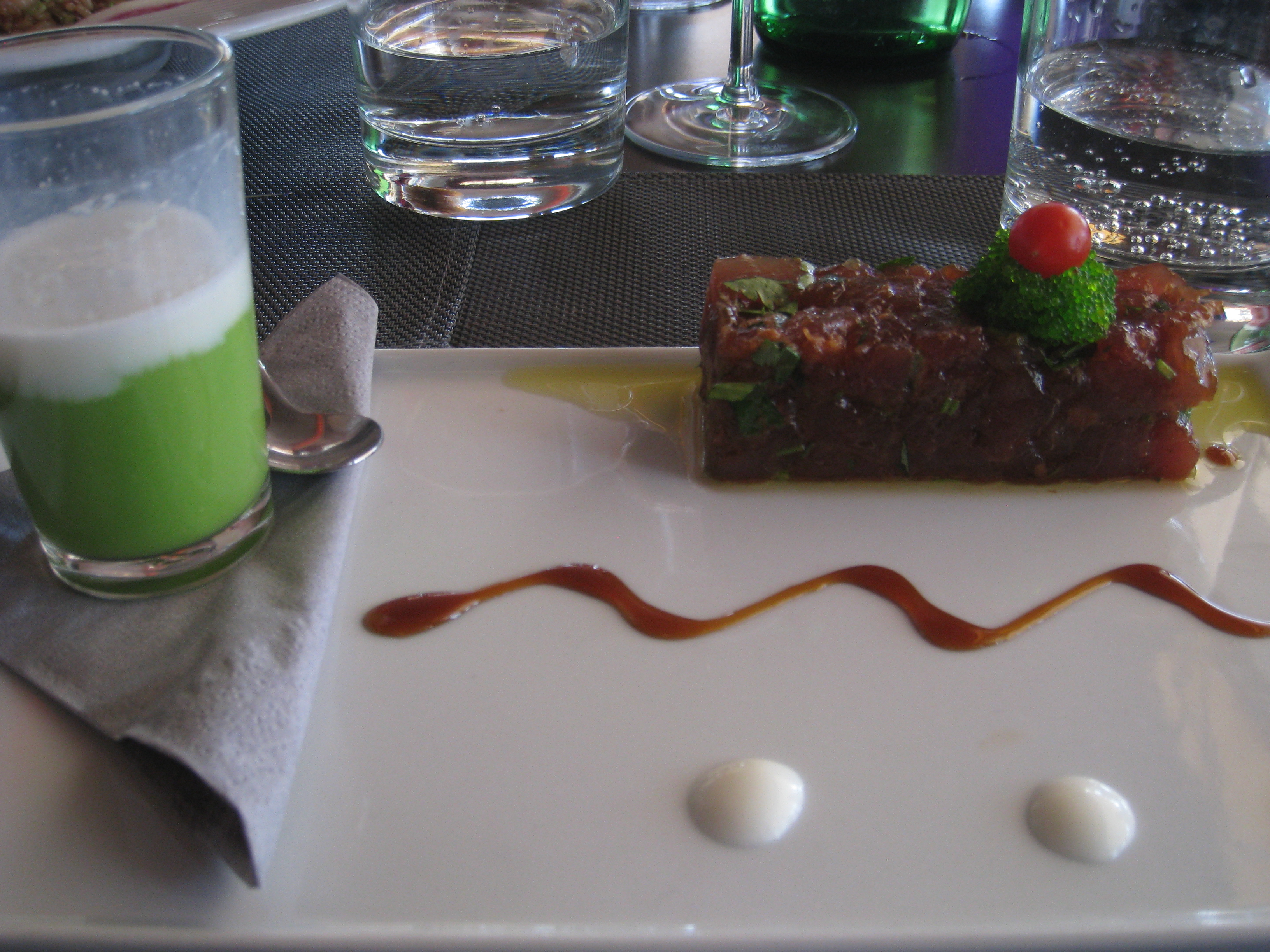 I followed on with a starter size of red tuna tartare, presented South-East Asian style, with a garnish of small beads of wasabi that looked just like luminous, green caviar might. A verrine of refreshing petits pois soup and mint ‘nuage’, or foam, accompanied the plate.