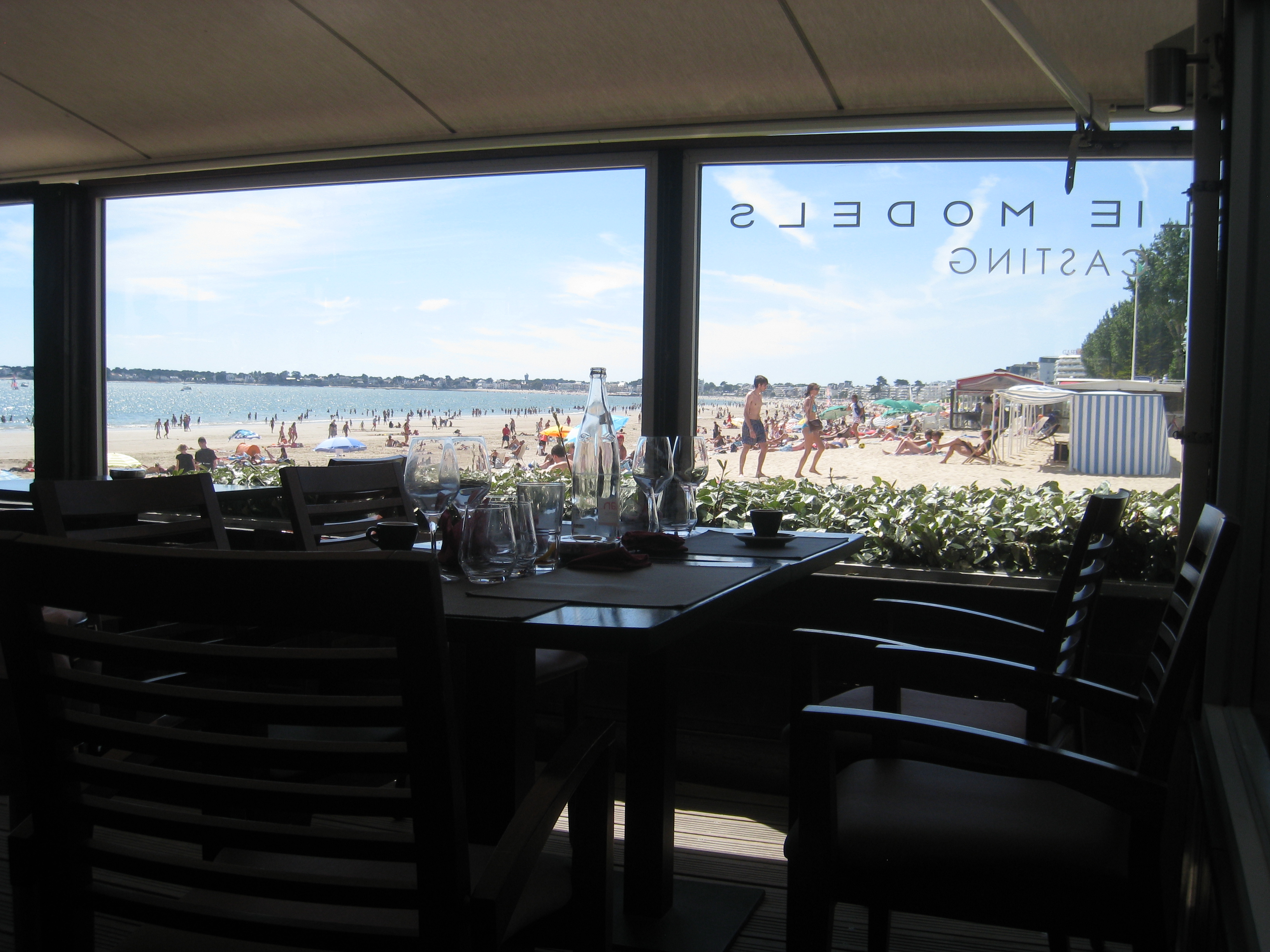 Our first day in La Baule we decided to take a stroll along the promenade, in the hope of finding lunch with a view. I was positively dizzy with all of the above concerns, not to mention the heat. We reached one eatery on the beach, but it was down on the sand with no ramp, only stairs. There was no way we could get the buggy down to the door so we walked on. Eventually, we found Nossy Be, a smart establishment, also on the sand, but with a navigable ramp leading down to the entrance. So far, so promising, but once inside my heart sank. It was so super-hip modern that if a mirror ball had suddenly started twirling to the latest euro-beat, I wouldn’t have been at all surprised. As for the patrons – they were all perfectly bronzed, in crisp polos and Bermudas, or ethereal kaftans with the style of sandal that wouldn’t have looked out of place on a goddess lunching at Mount Olympus. I, by contrast bright white and elephantine, was absolutely certain that we weren’t their kind of desirable and prepared for the ‘I’m sorry, we have no free tables,’ brush-0ff, especially as I couldn’t see any space for us in the bustling restaurant. I was wrong.