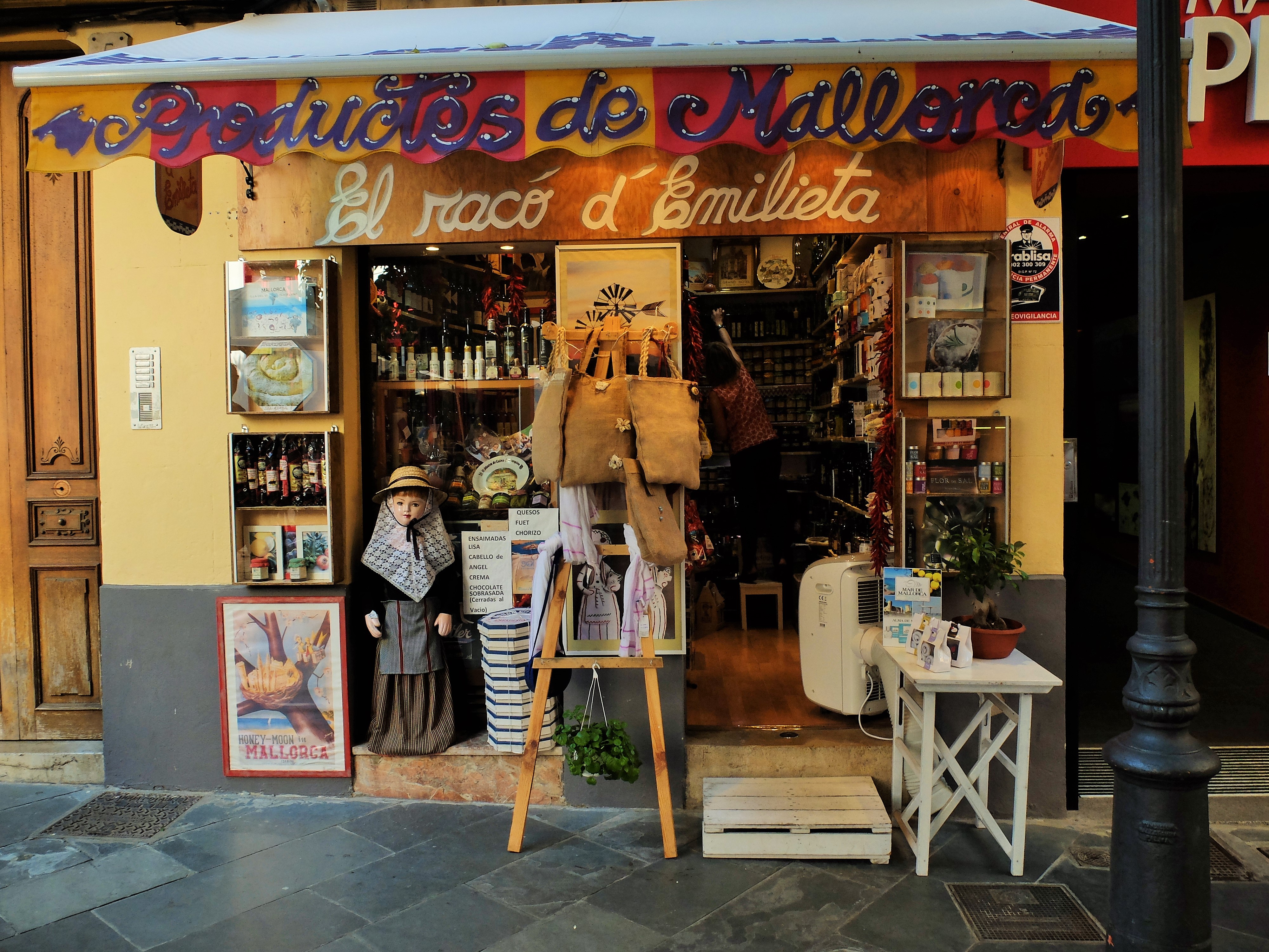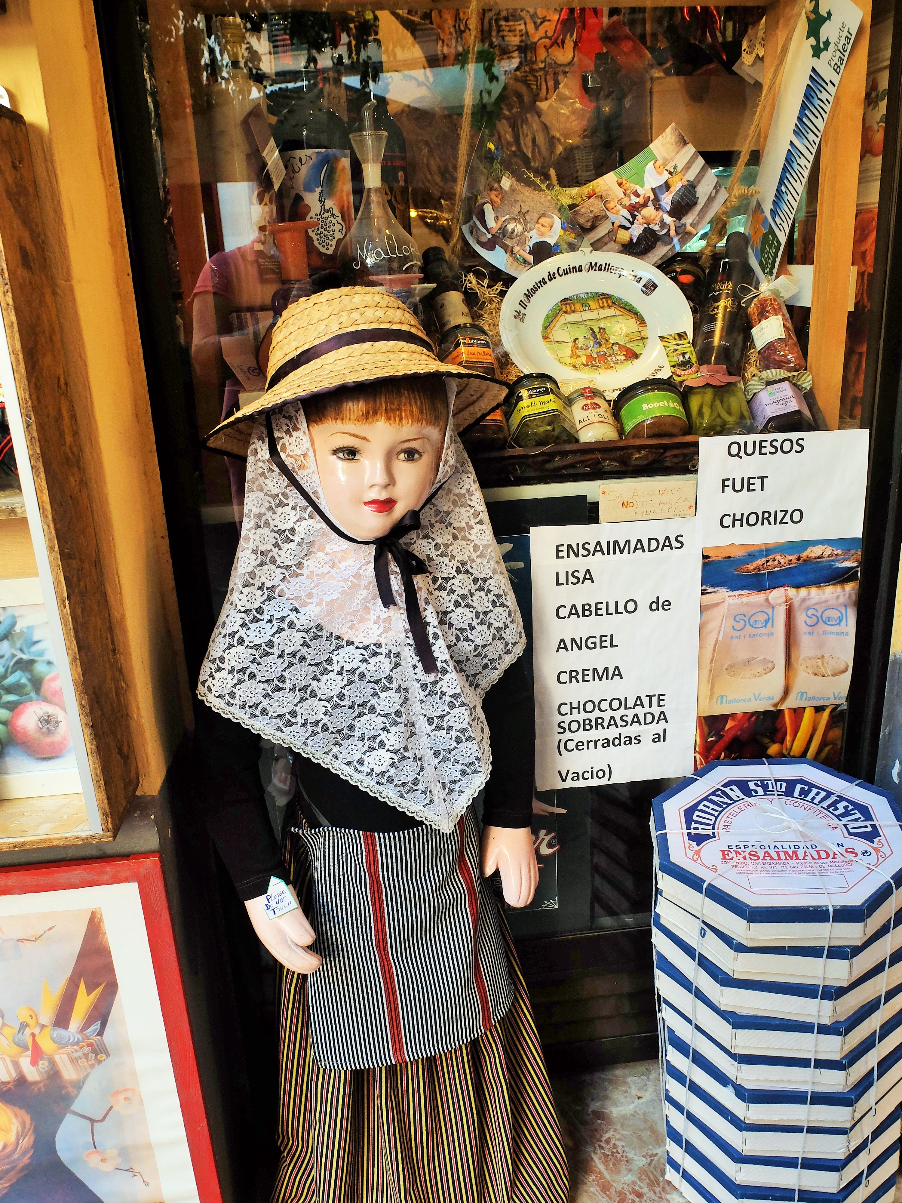 Many shops sell Mallorcan delicacies: from dried sausage and flavoured oils to the popular ensaimadas – large, spiral-shaped pastries filled with sweet cream or marmalade, almond paste or a host of other sweet surprises. I was particularly drawn to the Aladdin’s Cave frontage of this little store of Mallorcan produce.