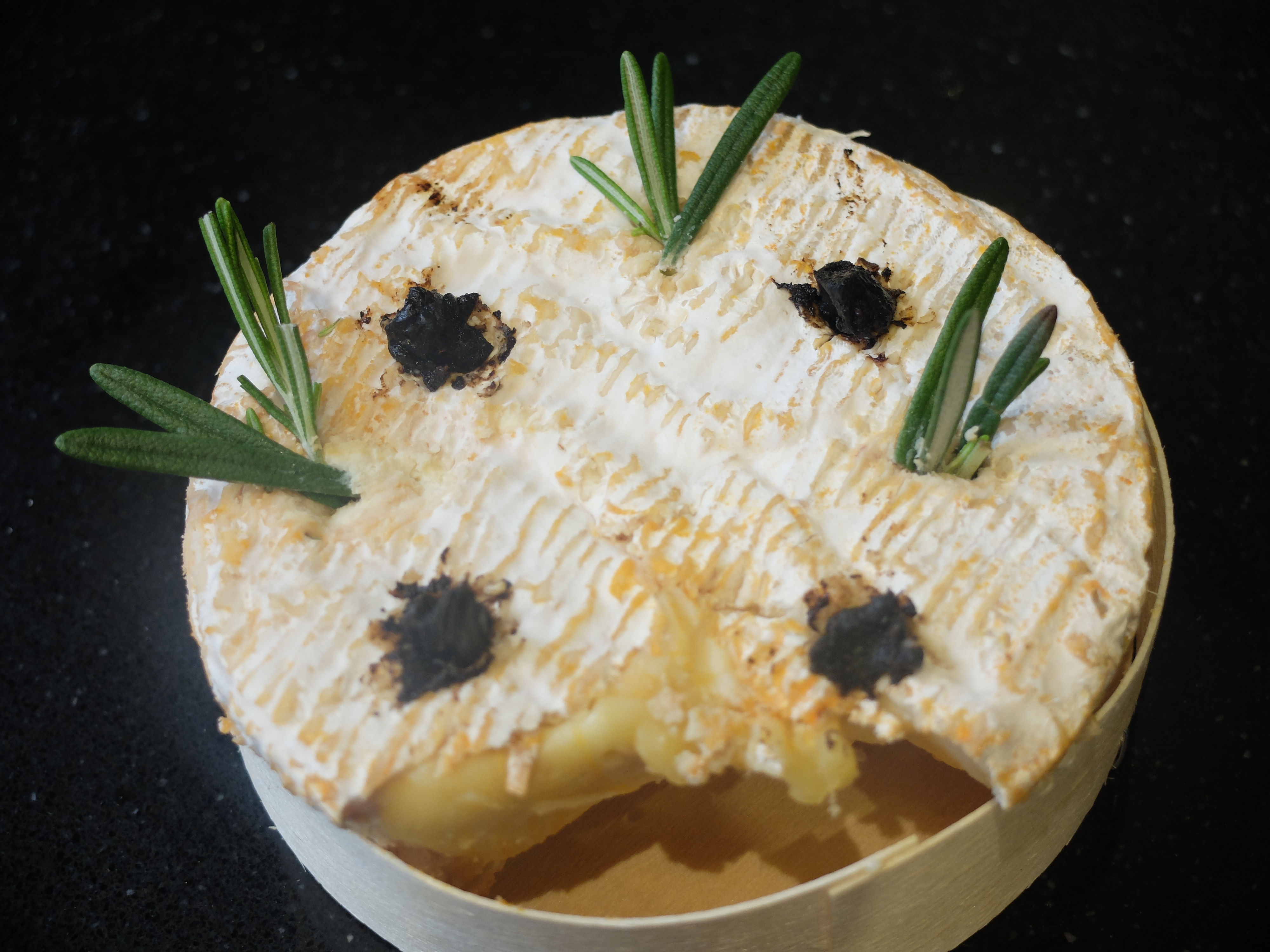 Tip the Camembert out of its wooden box, remove the wrapping and carefully squeeze the cheese back into the box. Using a small knife make a few slits in the top of the cheese and insert the garlic slices and rosemary leaves.