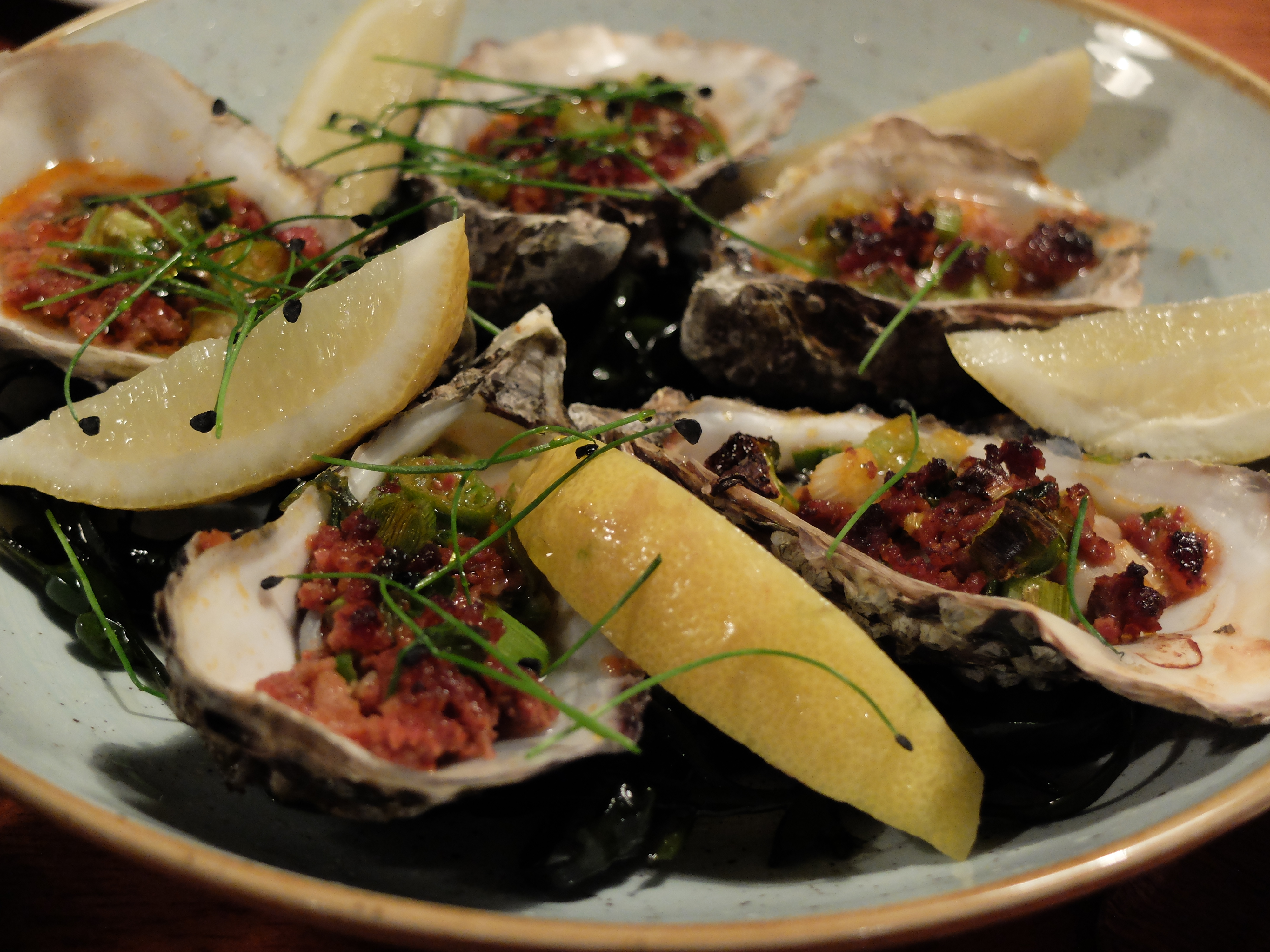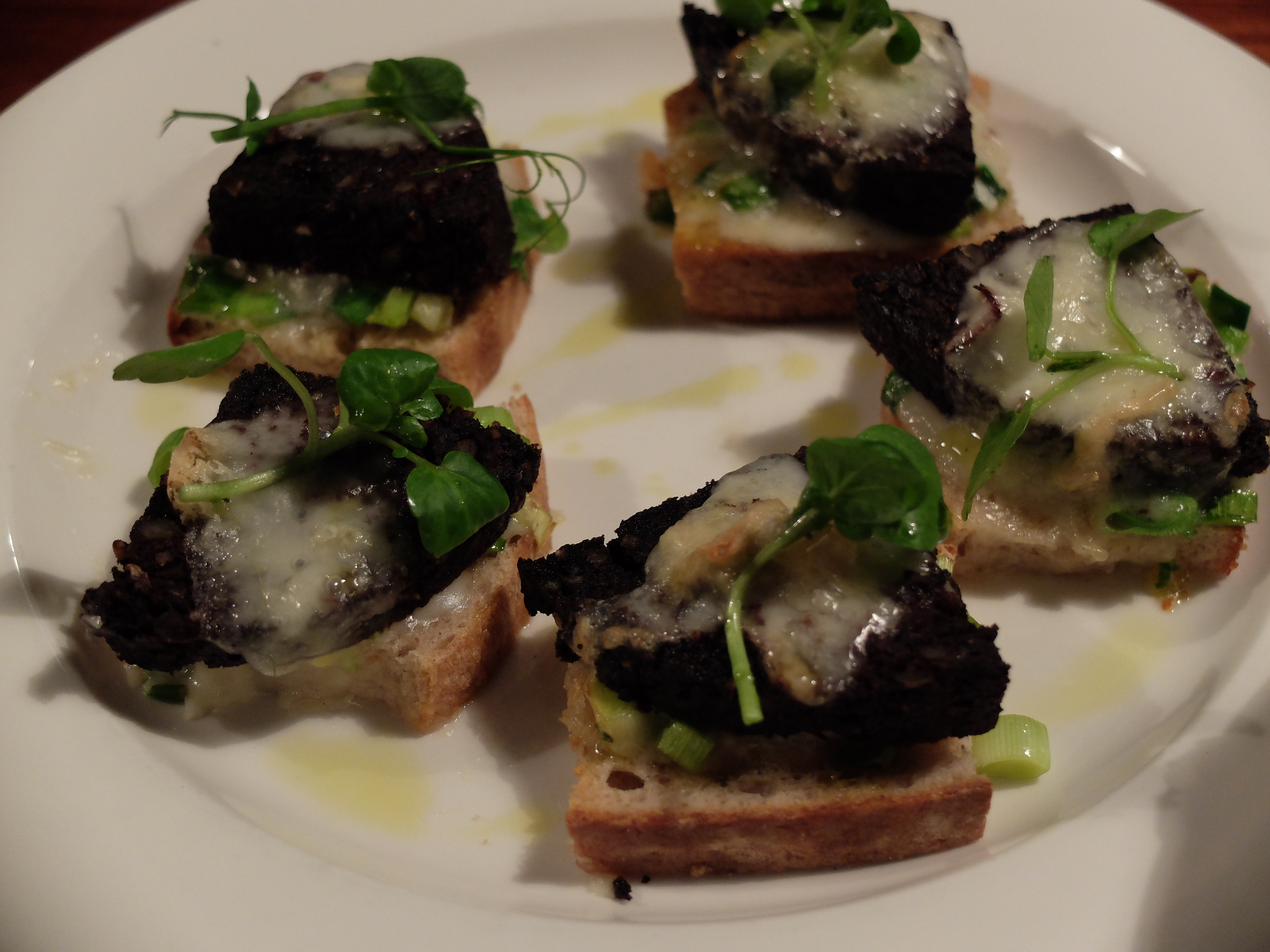 Barbequed Carlingford oysters with Merguez sausage and spring onion were first to appear. Served warm in their shells, on a bed of Neptune’s necklace, each one exuded a magical mix of ozone and spice. The next platter was my absolute delight of the entire day’s eating: Jack McCarthy’s black pudding, from Kanturk, County Cork, garnished with baby leeks and gooey gorgonzola. Suddenly, I was back in my grandmother’s kitchen, the fire sparking away, Toby jugs on the mantle, with plates of a proper, Kiwi fry-up before us on the dining table. My grandmother often served black pudding with her cooked breakfasts. It was store-bought but very tasty, not too fatty and decidedly too delicious to reject once I’d learned that the key ingredient of these dense, black sausages was BLOOD. As an adult, I’ve never found a black pudding as beguiling or balanced as those wolfed down during childhood winter holidays. Never, that is, until now. Mister McCarthy’s black pudding is smooth, almost completely devoid of lumps and fatty bumps, which I don’t exactly relish. Take a tin of black boot polish and you might start to visualise the look of the pudding, but there’s no way on this planet that you’d comprehend the taste and texture unless you’ve visited either Mr Jack McCarthy or Coppinger Row. Here, the black pudding was served on rounds of bread, resembling a tranche of solidified tapenade. The gorgonzola was melted atop these dark mouthfuls, with a green sprinkle of baby leeks lending a touch of spring to the presentation. I could write an entire post about this black pudding, but I won’t. Not today, anyway. The point is that if you like black pudding, this is one worthy of lengthy analysis and description and perhaps a quick trip to Dublin Town.