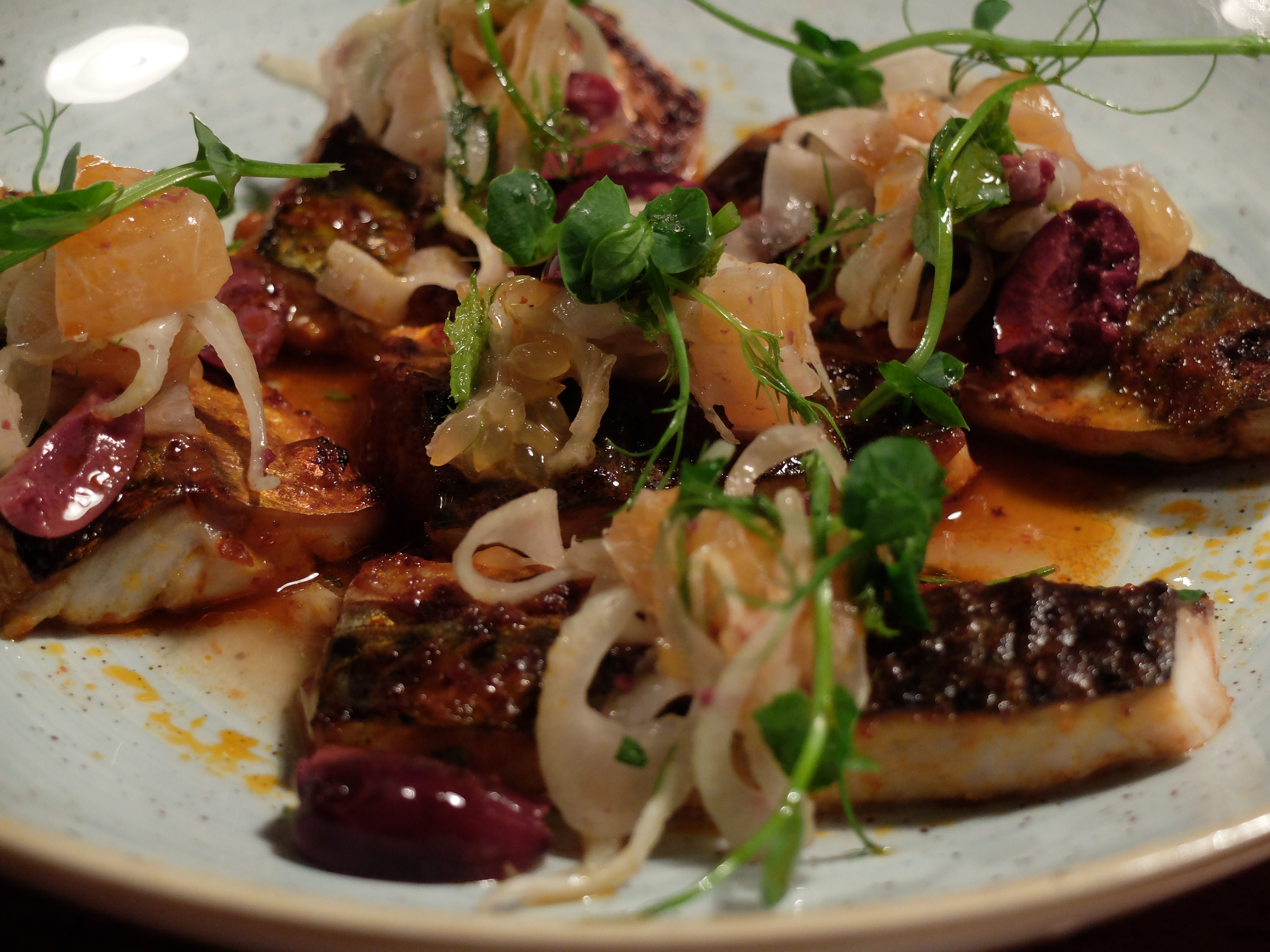 Another platter from the sea was now before us: Kilmore Quay Mackerel with Moroccan spices, fennel, olive and orange. I’m a huge fan of this versatile, inexpensive fish. Then again, I don’t know many pescavores who don’t rate it well. Once more, the touch of exotic heat and fruits of the sun took my taste buds on a quick flit about the Med. Supple and silky was this Irish fish.