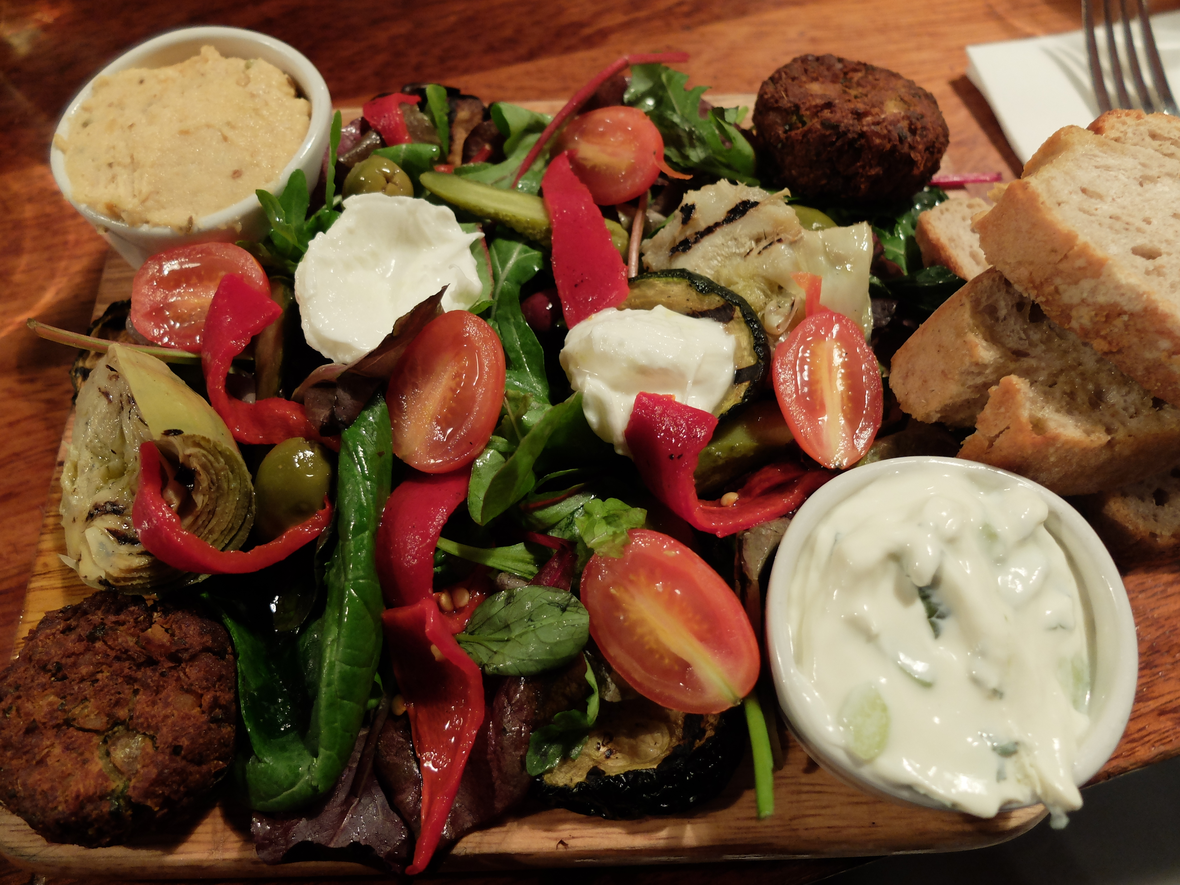 We were now able to diverge from the tasting menu that had been created for us, in order to try something of our choice from the menu. One of our group ordered the pulled pork, another the open meatball sandwich, which is apparently legendary here. Grilled steak on flatbread, dressed crab and crayfish with basil and lemon, spinach and ricotta gnocchi with gorgonzola cream… all received pretty solid praise from around the table. We were off to eat again in a few, short hours, so in an attempt to reduce my intake I went for the vegetarian mezze plate and antipasto board. It was essentially a salad served on a breadboard with ramekins of houmous and tzatziki on the side. I do admit to being more accustomed to the antipasto components being distinct, instead of tossed together. That’s not to say that the mezze plate wasn’t good. Every chunk of artichoke, bite of mozzarella and salad leaf was, at the risk of being cliché, farm-fresh and flavourful and once more, the Med was right there, hovering bright in the background of this grey Dublin day.
