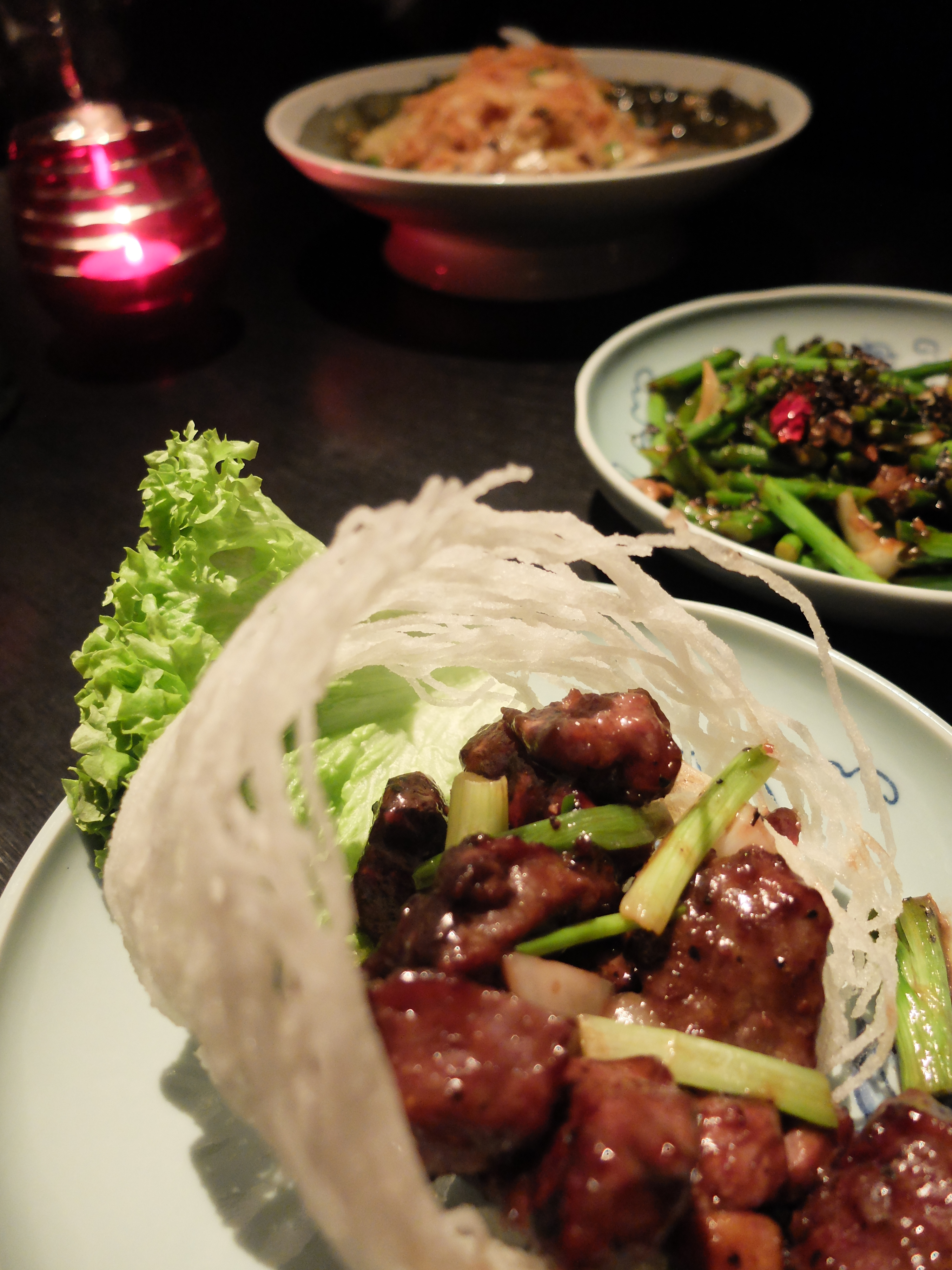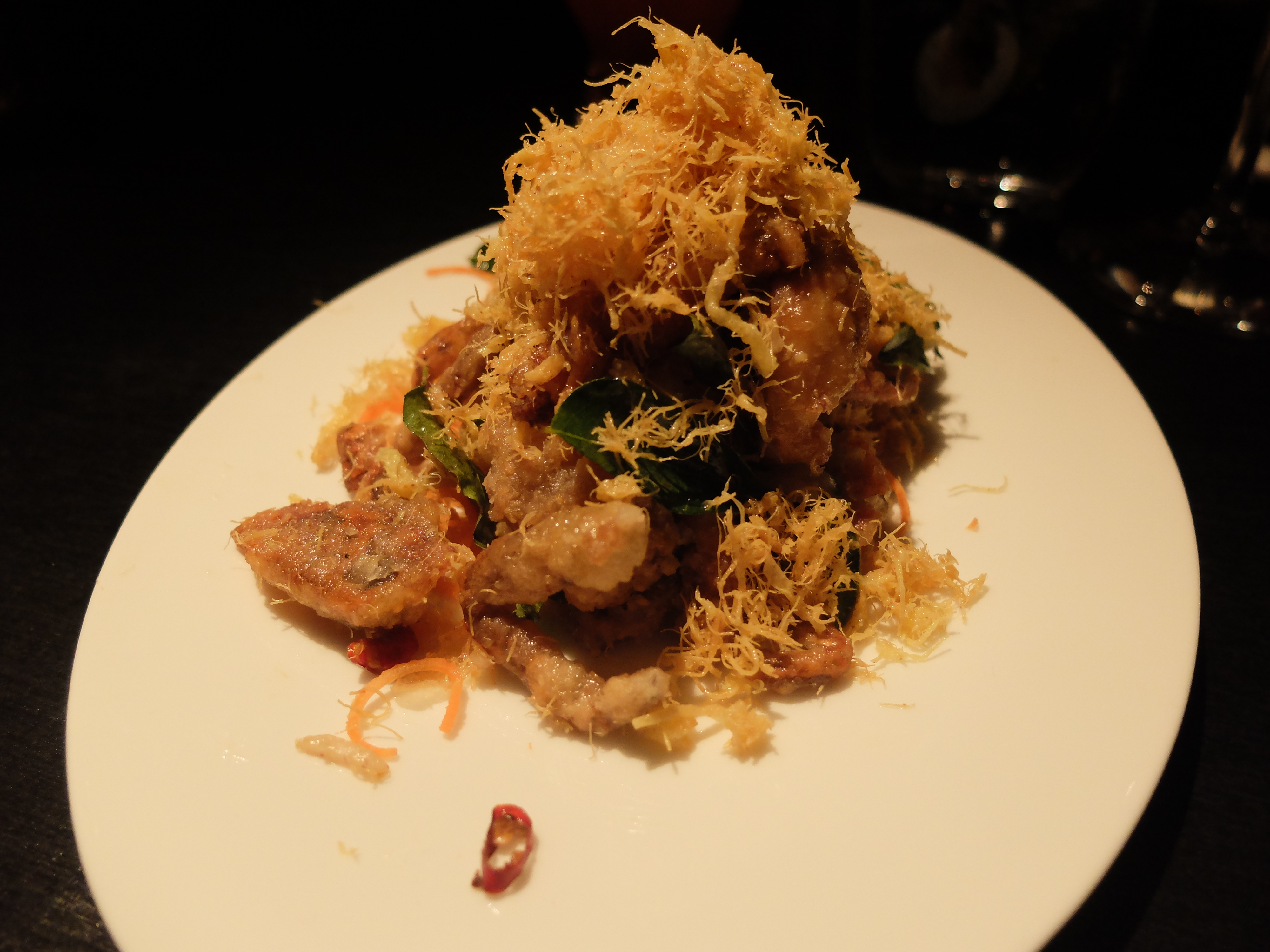 Just when we though the lamb was a star upon the night sky of Hakkasan starters, along came the Golden Fried Soft Shell Crab. I have to say that soft shell crab has long featured on my death row menu. So delicate, yet softly crunchy, with that ozone of Neptune’s lair. I love love love it. Somehow I encouraged my husband to eat more lamb, whilst I tucked into the crab. How strategic can I be, when faced with a favourite foodstuff? Like Sun Tzu on the battlefield, I’d say. My wiles worked; I got more juicy crustacean. Hot. Spicy. Crunchy. WONderful.