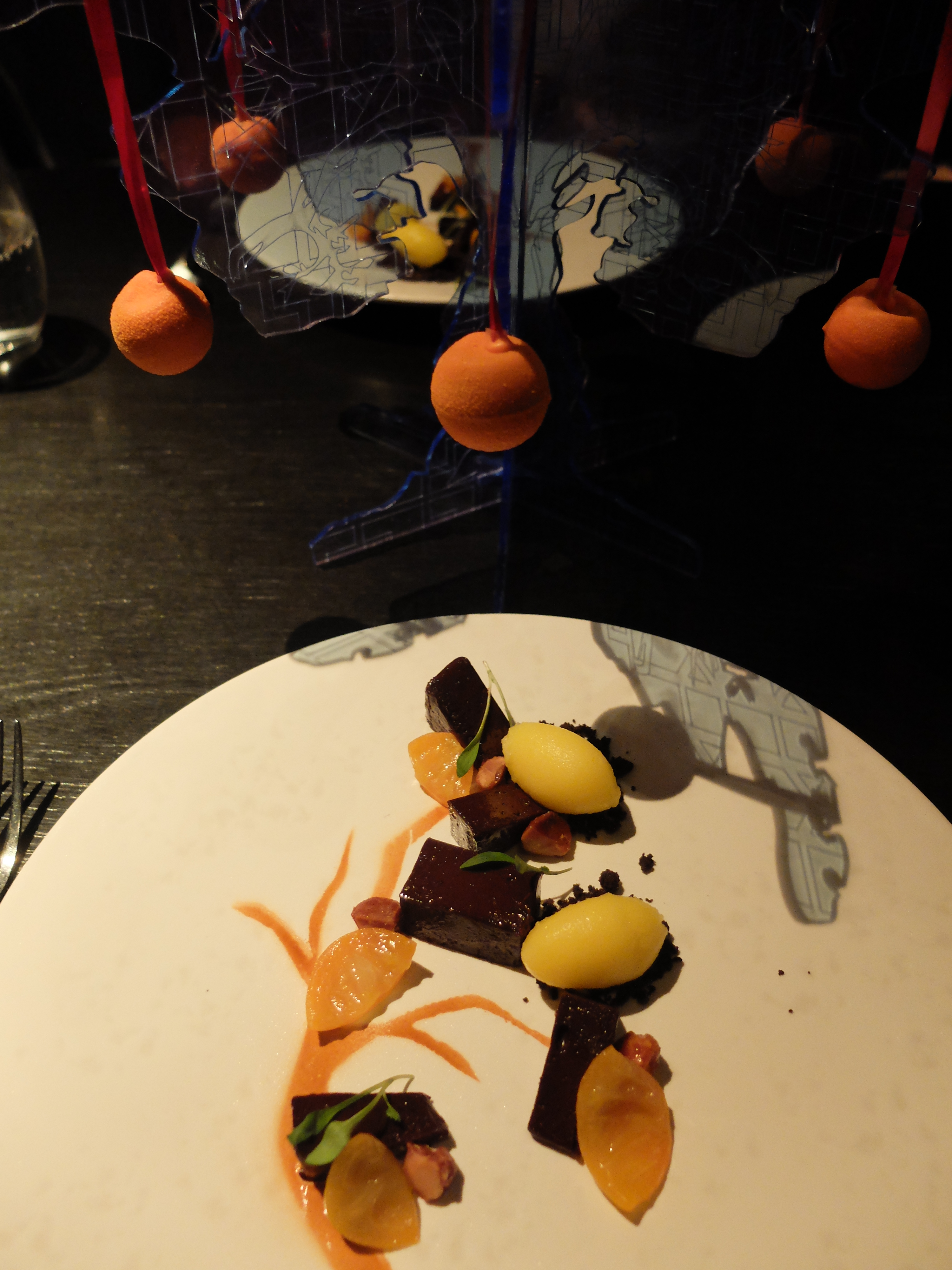 If the above hadn’t been good enough to wow my discerning buds of taste, the next and final dish would. A plastic tree arrived at our table, with kumquats hanging from its branches. Or were they? At first glance they looked like kumquats (small, orange, round) but the fruit had been squirrelled away inside spheres of chocolate, then coated with orange to resemble the fruit. As the tree sat between us on the table, another tree had been painted on our plates and dressed with chocolate, caramelised macadamia nuts and rocks of cocoa. Creative, sweet, light and fun. Then, in case we weren’t getting quite enough kumquat, our waitress encouraged us to try the Kumquatcha, a Chinese New Year cocktail, containing Germana cachaça (a Brazilian white rum), Campari for colour, kumquats and lime. It tasted like very grown up fruit cordial with a touch of the tropical and plenty of sweet citrus taste.