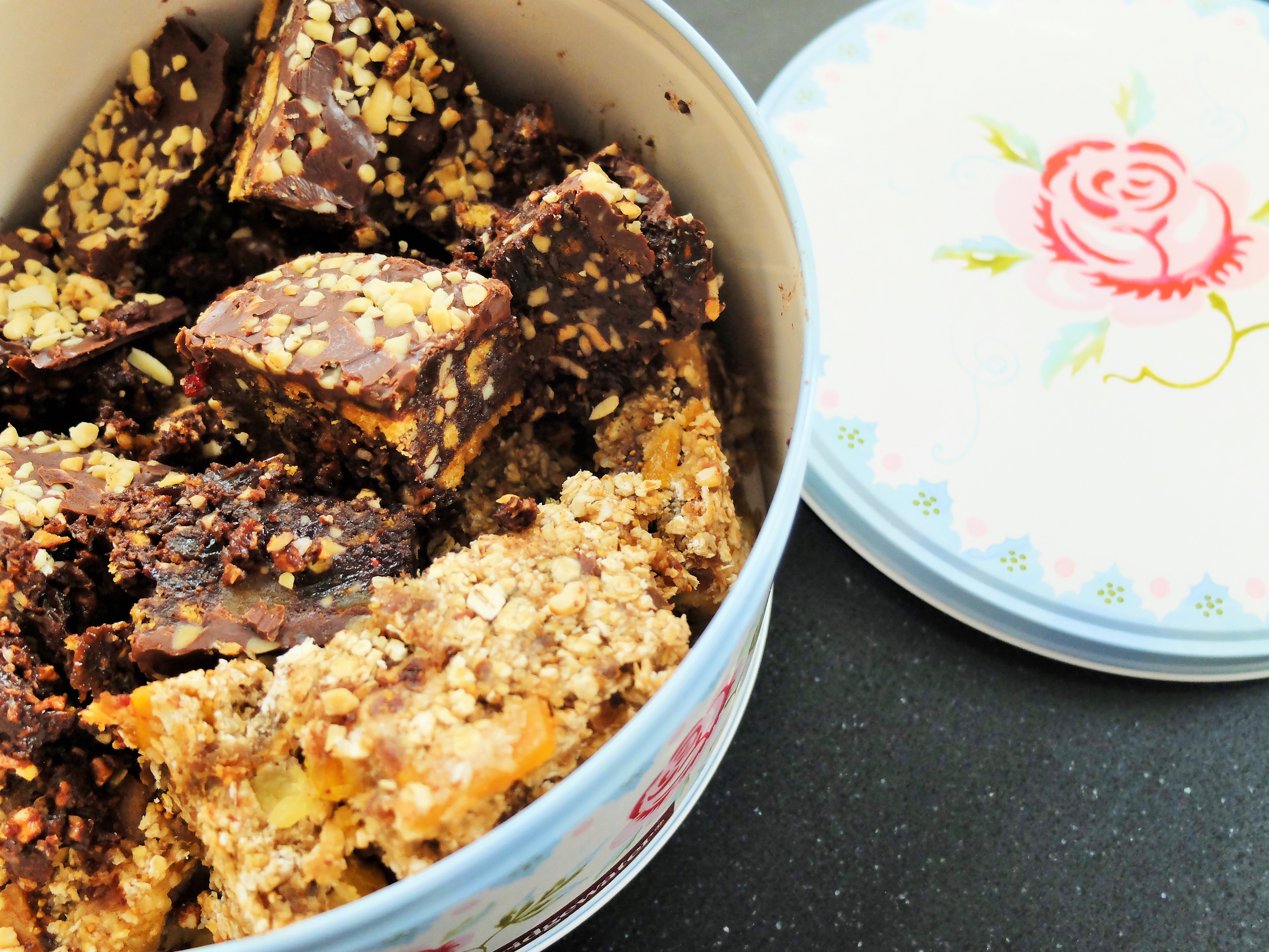 A tin filled with Fruity Tiffin and Tropical Breakfast Bars